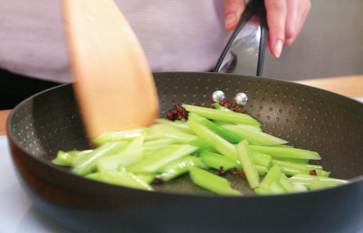 3、放入芹菜翻炒,撒入适量的盐;