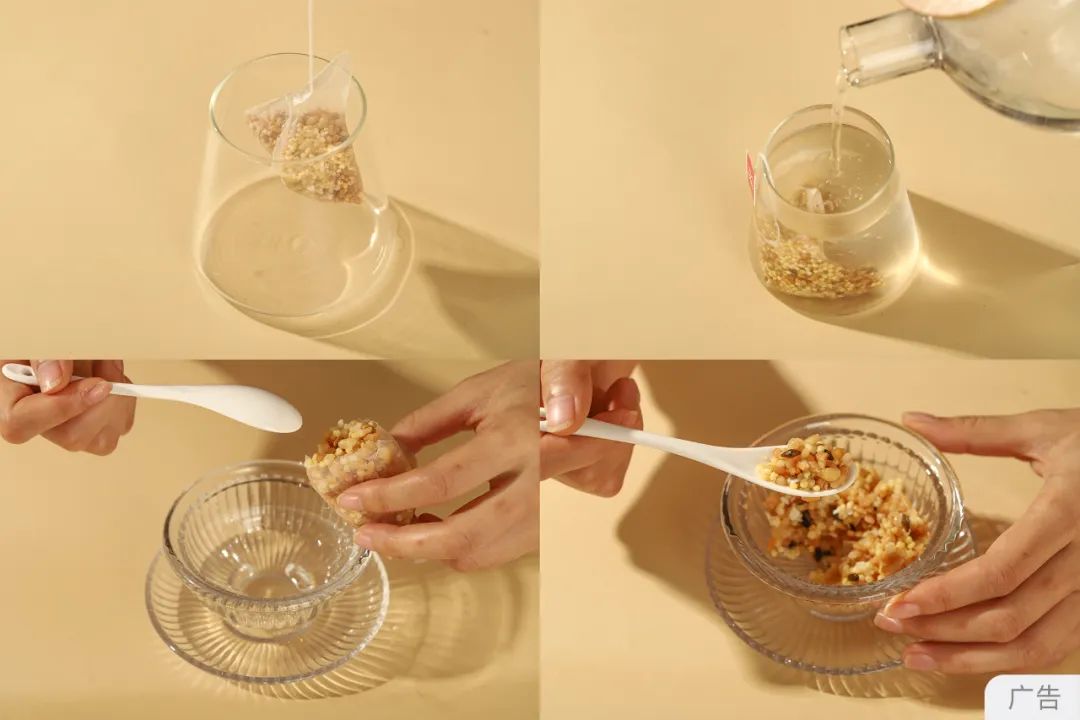 食材在精不在多,6种看得见的纯粹原料,0香精0色素0防 腐 剂,您和孩子都可以放心喝。这款味舒焦米茶可泡可煮,看着汤色清亮、焦香四溢,泡熟后的茶料喝完汤,还可以吃掉。