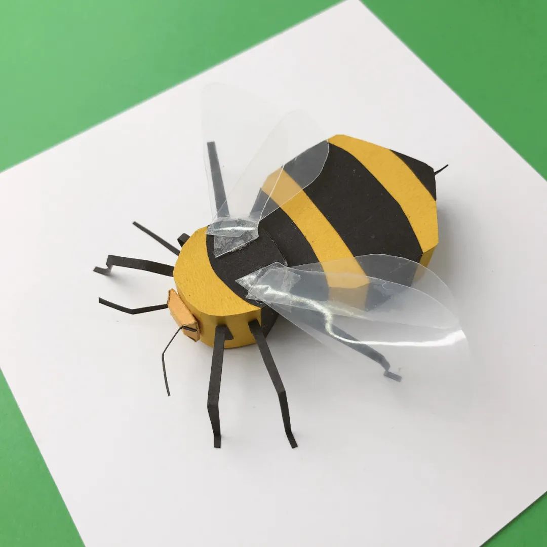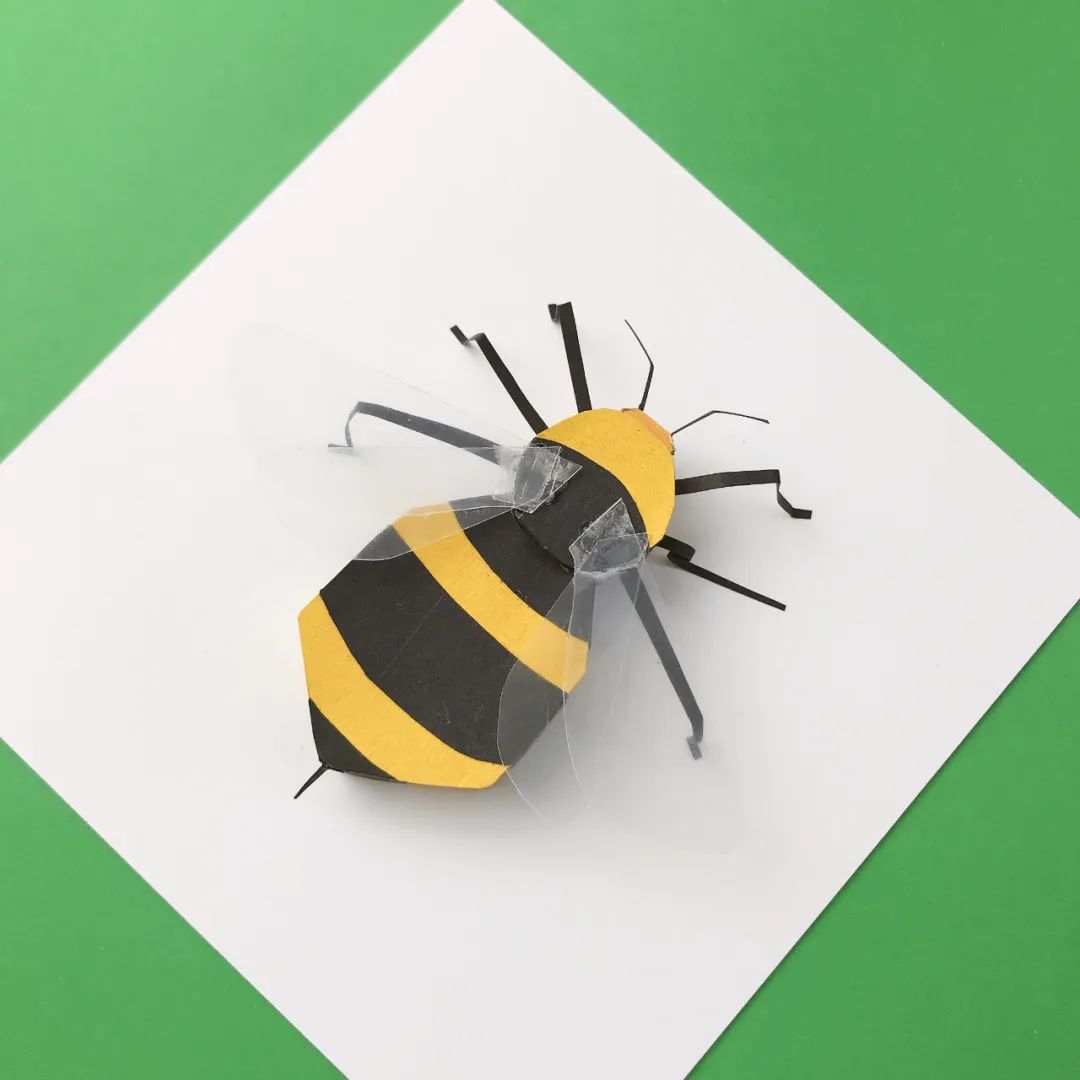 作品材质利用了彩色卡纸和废旧的塑料。纸张是我最青睐的手工材料,通过剪裁折叠可以做出有几何感的蜜蜂身体和足。废旧塑料选择了透明质感的,用来模拟蜜蜂透明的翅膀,也是废物利用的尝试。
