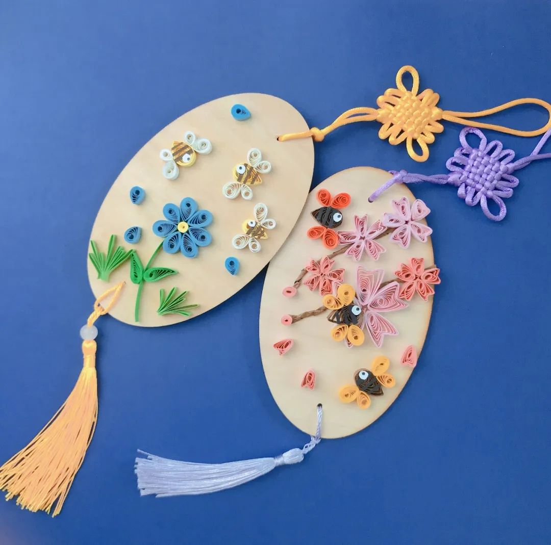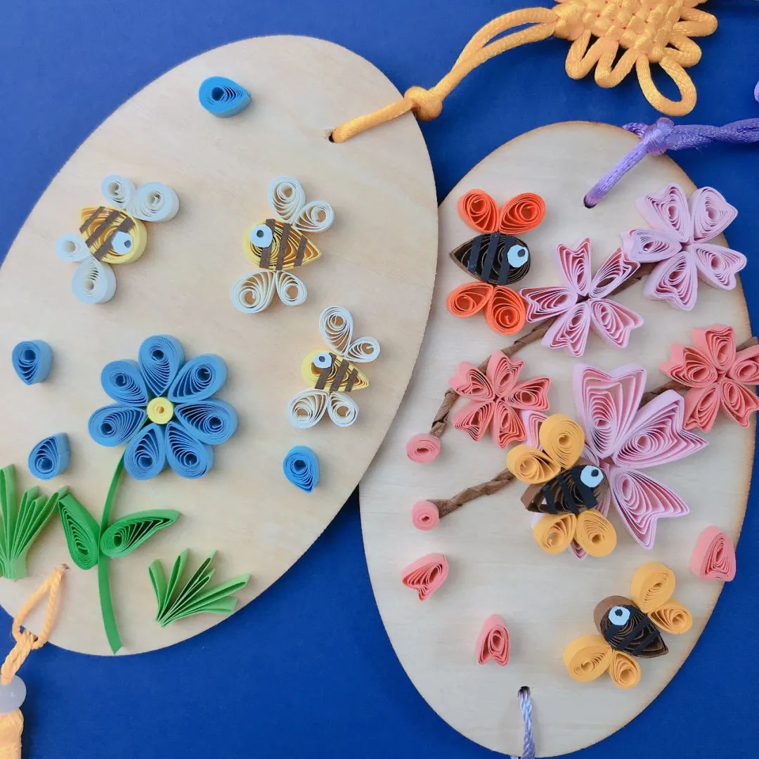 主要都是彩纸,进行不同的捏法,色彩搭配,做出不同的造型,蜜蜂也偏向于卡通形状,用花与蜜蜂的叠加,组成不同的图案。