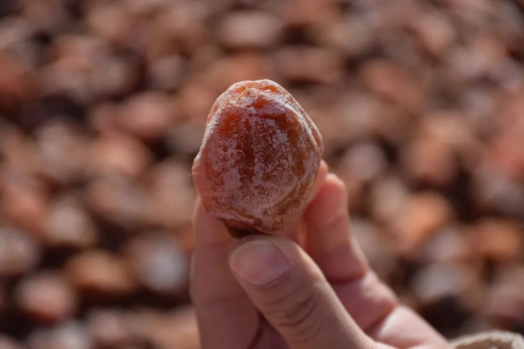 ps:好“柿”成“霜”,为什么柿饼表面会有白霜呢?其实是因为鲜柿子水分含量多,经过长时间的晒制后,果肉中水分蒸发,糖分就渗透到表皮上来,形成了一层白色的霜状物。因此想吃甜甜的柿饼要选自然挂霜了的哦~- 今日互动 -