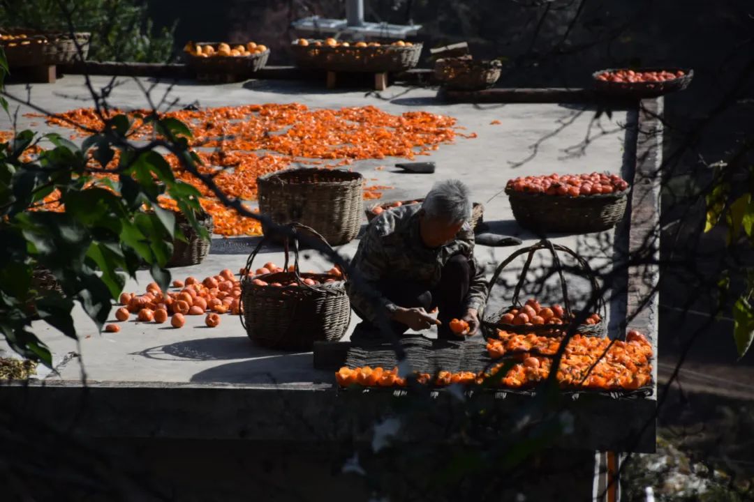 说起来,柿子树还真的有点特别。比如柿子开花时间很晚,别的花3、4月开,而它要到5月;再比如,别的树果子先成熟再落叶,而柿子却能在树枝上坚持到下雪也不脱落。岁寒,然后知松柏与柿子之后凋也——柿子的成熟,也预示着冬天的来临,每年到立冬前后,就是山里人大批下柿子的时候上个月,我和玲子姐一起去柿子基地拍照,给大家做直播,这也是我第一次到谦益山西的柿饼基地。在远离县城的山谷中,村里的人不多,柿子树都是老树,“散养”在山谷的地边和山坡上。