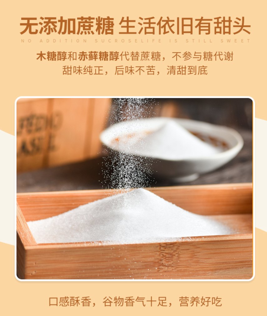 根据中老年人的需求,我们的这款饼干不添加蔗糖,选用木糖醇和赤鲜糖醇代替蔗糖。