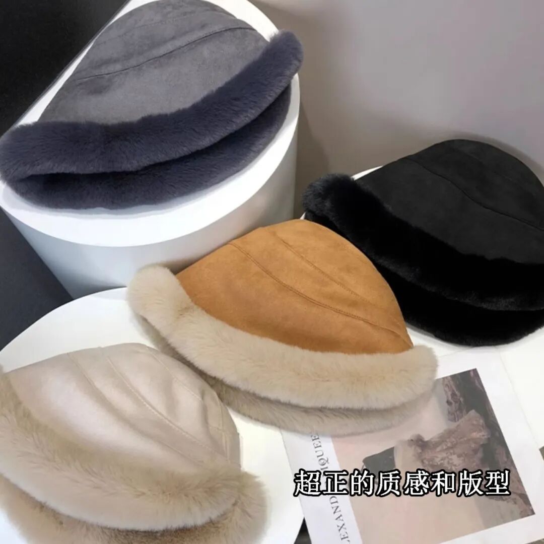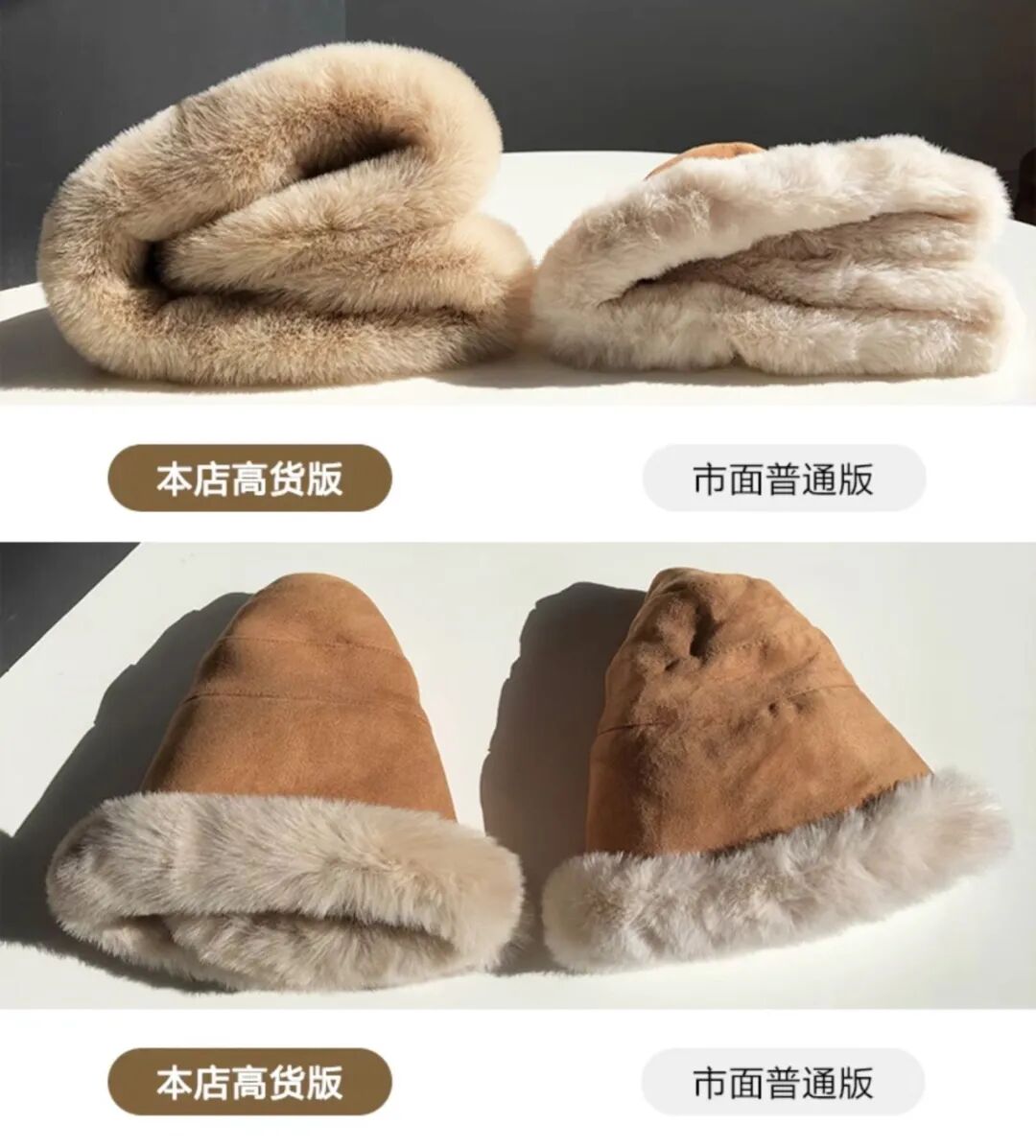我们的是高货版,毛绒量和质感都很足,版型更好看,戴上显脸小;其他版本用料做工粗糙没有质感。
