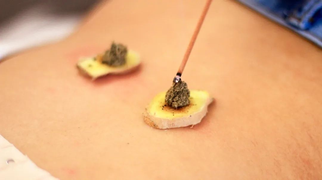生姜置于肚脐正上方,再用艾条悬灸,以感温热且舒适为度。每次灸15~20分钟,隔日1次,每月灸10次。