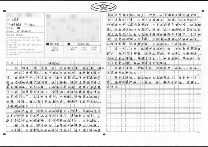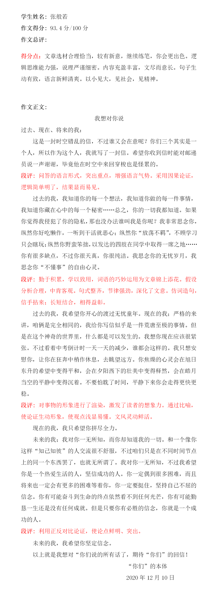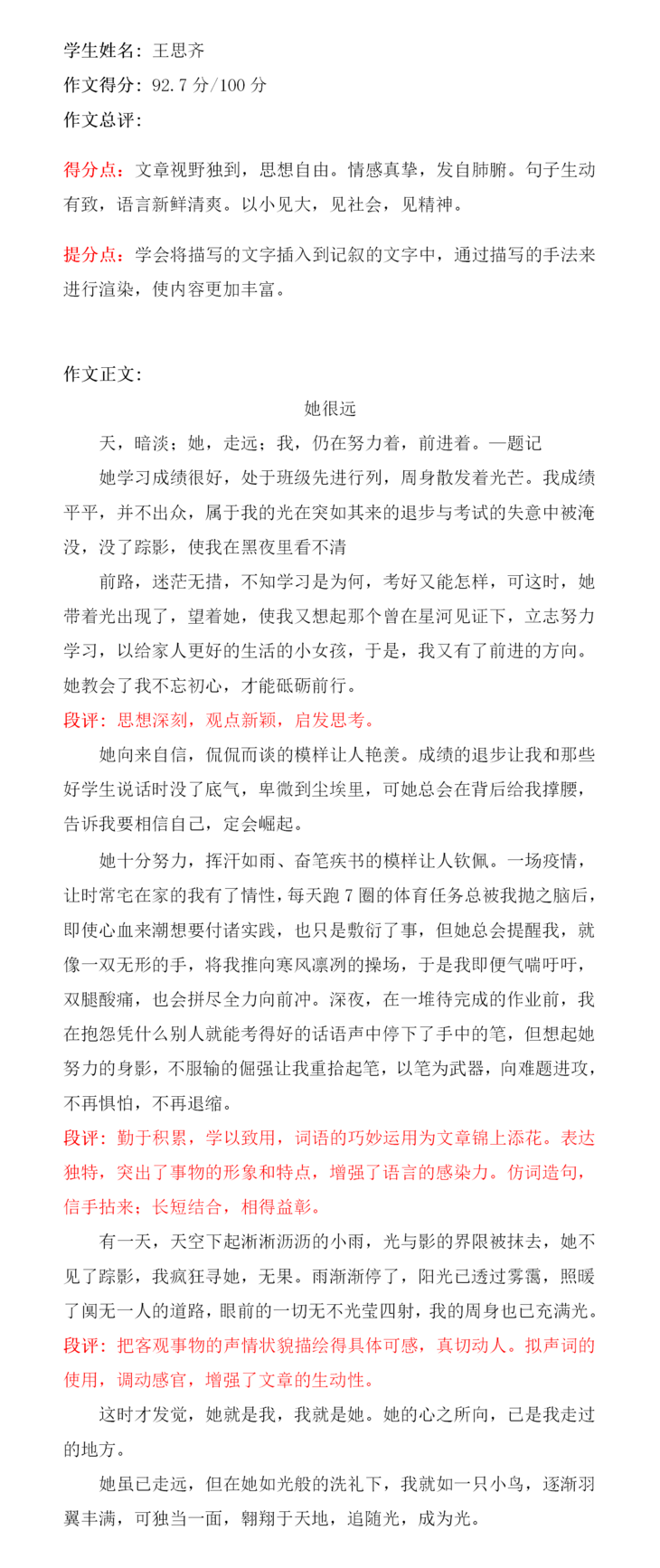 初中的写作需要有深刻的人生感悟和心灵体验。上了初中后,在老师的指点下,孩子的思维能力有了很大的提升,作文的立意更深刻了,孩子的成长得益于老师的指点和熏陶,正如青花瓷的美是经过烟雨天的熏陶。看到孩子的这篇文章,我很欣慰,希望你多阅读、多记录、多积累、多思考、多练笔,打开自己无穷的想象,描绘你心中的世界吧!