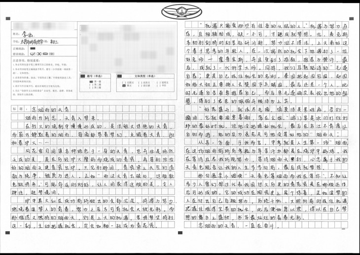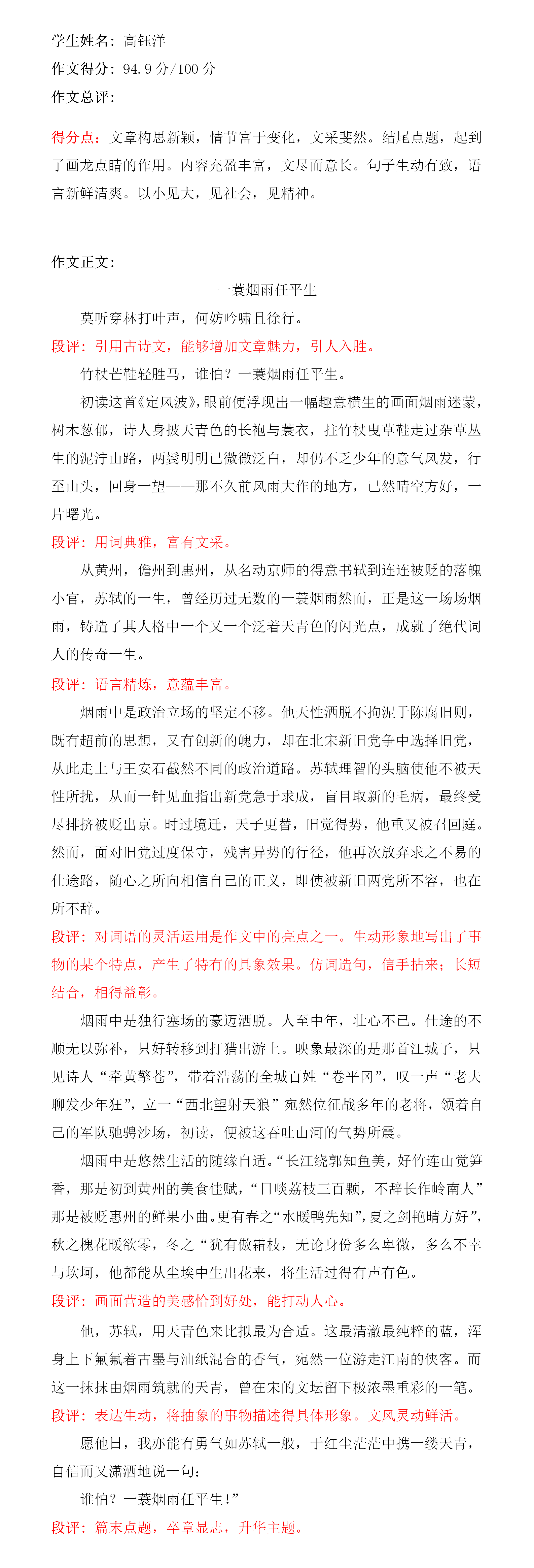 "机遇与努力相辅相成,才能成就梦想。"小作者从文题材料中另辟蹊径,将"烟雨天"比做人生机遇,将经过磨砺的"天青"比做自身的努力,要想取得成功,实现人生理想,只有"烟雨天"或者只有"天青"都是不够的。立意新颖奇特,高人一筹。文章旁征博引,列举了科学界麦克斯韦、中国古人毛遂和项羽的故事从正反两个方面来论证了这个核心观点。全篇比喻论证形象生动,正反对比论证增强了论证的说服力和思辨性,最后落脚到自身实际,结构圆融一体,浑然天成;内容丰富充实,论证思路条理,是一篇观点鲜明、论证严密的优秀篇章。