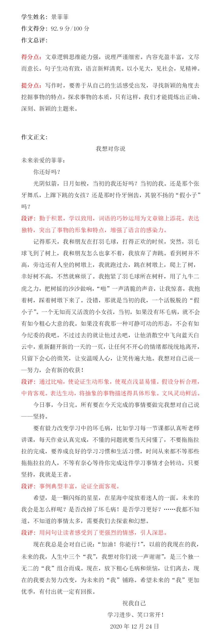 你是一个积极向上、对自己有要求的孩子,但有些事情是需要一点一点来的,爸爸妈妈会陪着你走过每个平台期和转折点,慢慢来,不着急,你走的每一步路都算数。希望你永远是那个眼里有光,心中有爱的少年!