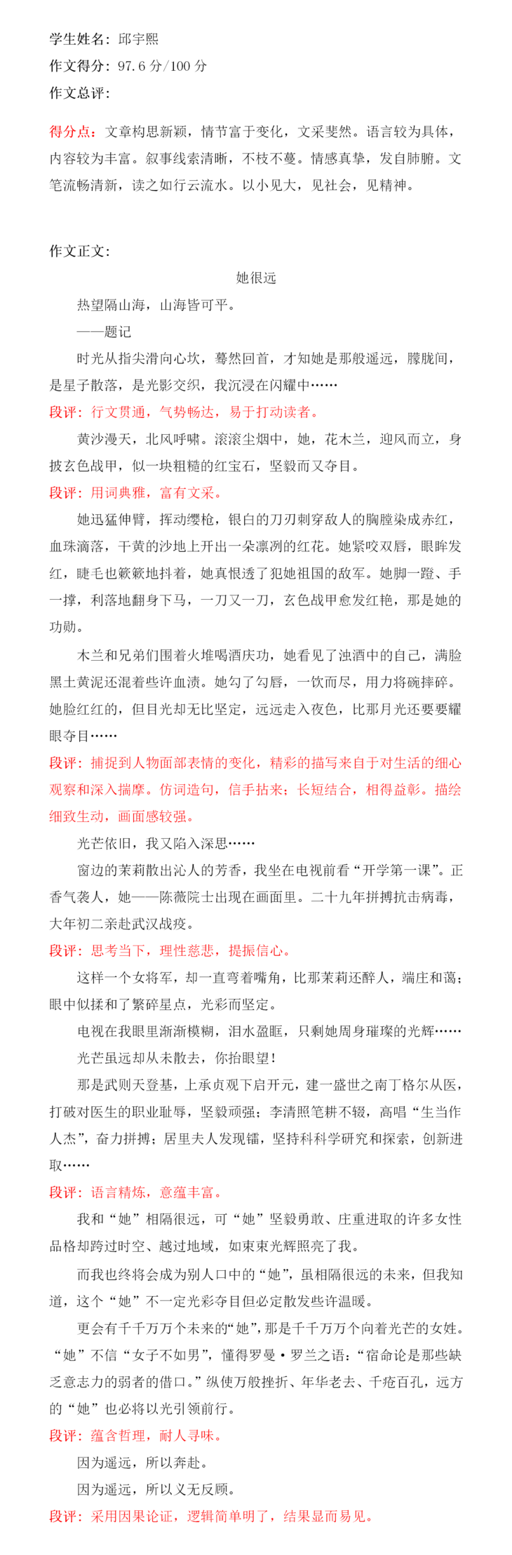 全文选材新意,段落分明,可读性强,语言流畅,构思细密,行文舒展自如,全文叙事中不蔓不枝,情感流露自然,真挚感人,文章内容前后连贯,捕捉到人物面部表情的变化,画面感交强,易把读者带入情境中,字里行间巧妙的勾勒出一个勤劳,坚毅勇敢的花木兰,端庄,尽职尽责的陈薇院士,有大作为的女皇武则天,坚毅顽强的李清照,不断创新的居里夫人……,结尾穿越了时空,寥寥数笔采用因果论证,回环复踏,感染力极强蕴含着虽相隔甚远,但愿意义无反顾的奔赴的感人道理。