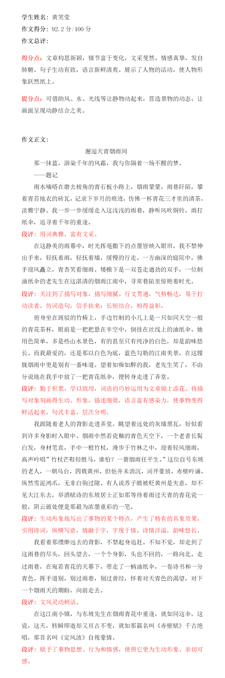 天青色渲染诗情,烟雨天蕴含期盼。文章用词准确,精巧点缀在句间,让人仿佛置身在烟雨朦胧的雨巷,静聆雨的嘀嗒。在雨巷阡陌中的老先生是文章主要描写的对象,从外貌、神态、动作描写,塑造了一个豁达的老人形象,行云流水。时时的环境描写,渲染了淡雅宁静的氛围,使文章增添一丝神秘感,更加顺理成章的突出中心。后从老人联想到苏东坡,引用诗词,诗情洋溢,突出了文章乐观积极的中心。青花瓷在烟雨天方可天蓝,作者在烟雨天表达了充满希望,期盼的憧憬,耐人寻味。