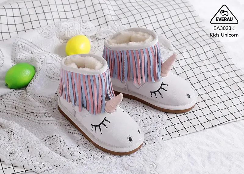 可爱造型防滑防水保暖男女童鞋,是小马宝莉联名设计款,融入了具有鲜明特色的3D独角兽形象,再结合双色流苏、羊皮毛一体的设计感,温暖保护、时尚潮流同步,也让儿童内心中更易形成共鸣。