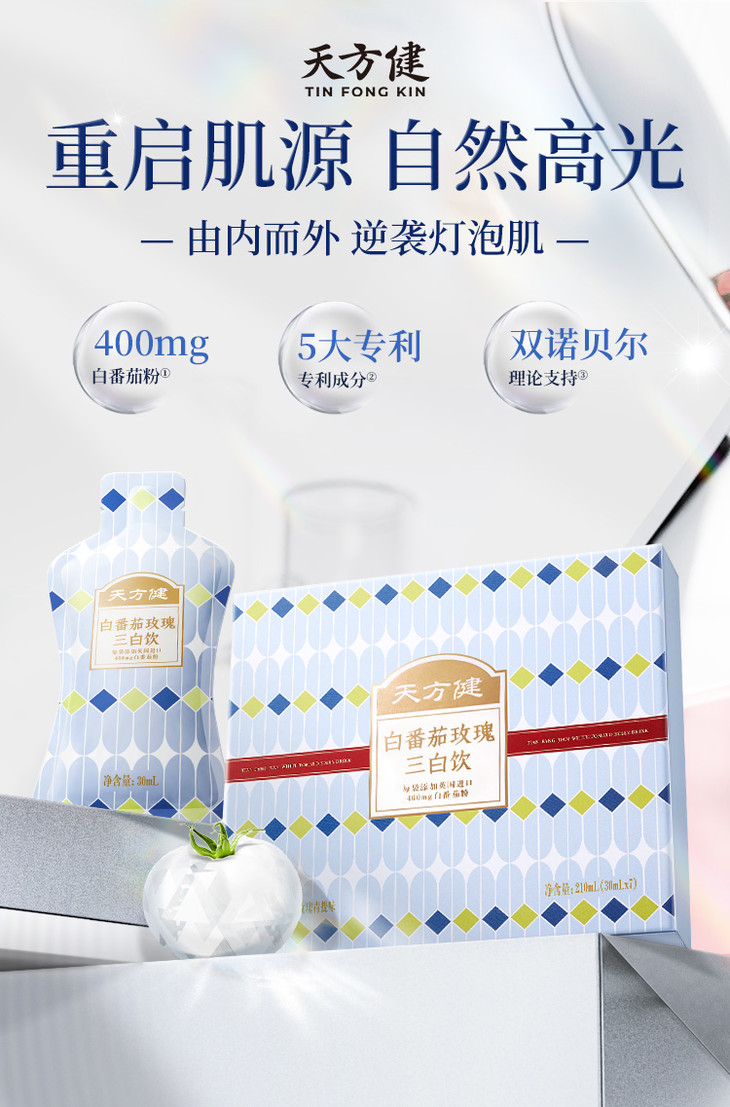 白番茄玫瑰三白饮每袋含有400mg白番茄粉,5大专利成分,双诺贝尔理论支持,让你重启肌源,自然的白到发光!