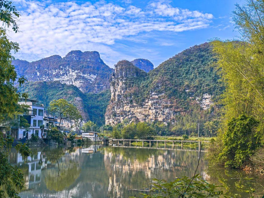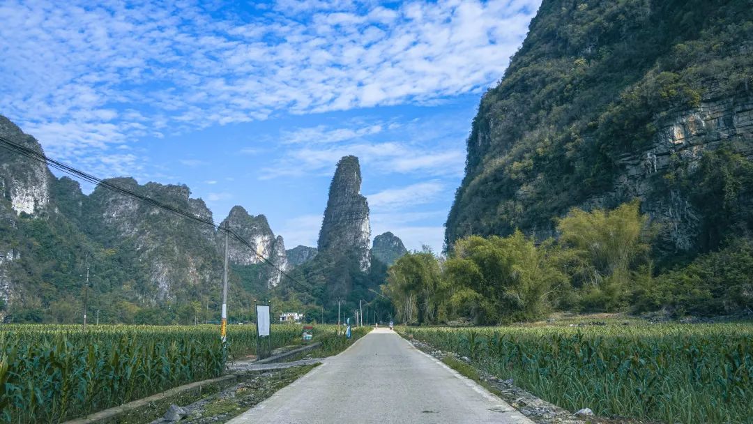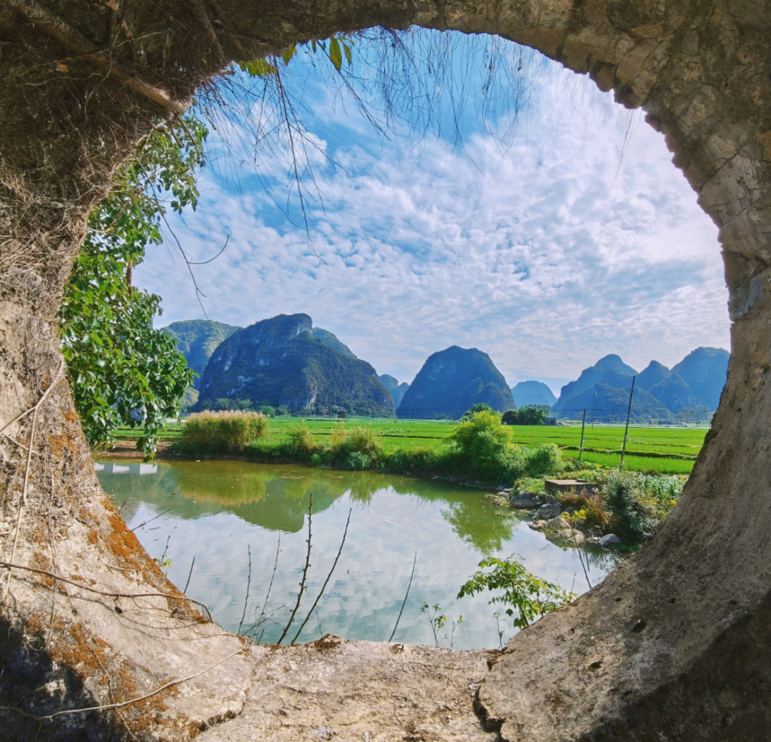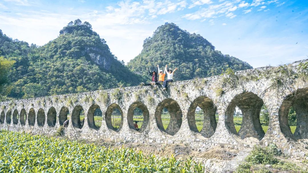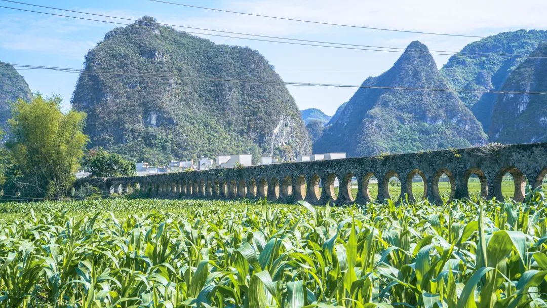 古老的渡槽横亘在田园上,渡槽蜿蜒,远处是喀斯特山峰,两边是稻田和玉米,中间流经河水,每一个圆孔都框成一幅田园山水画。