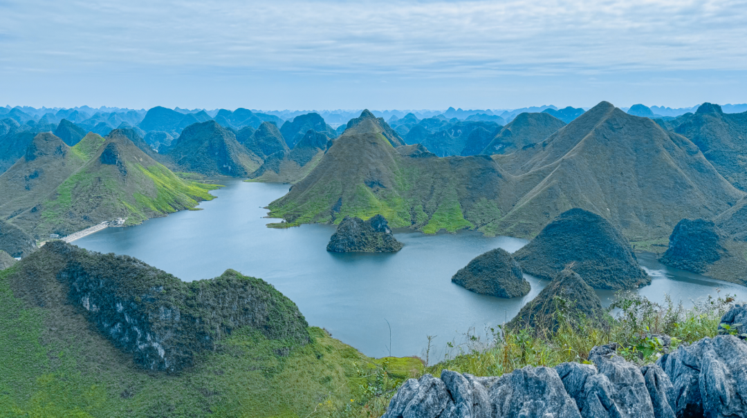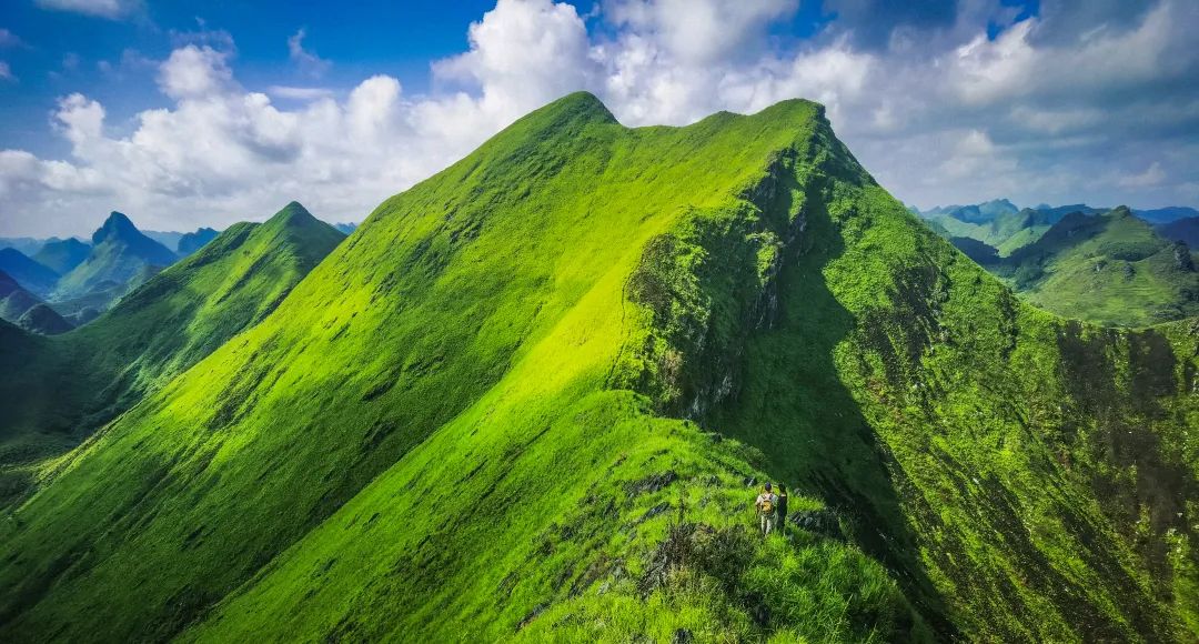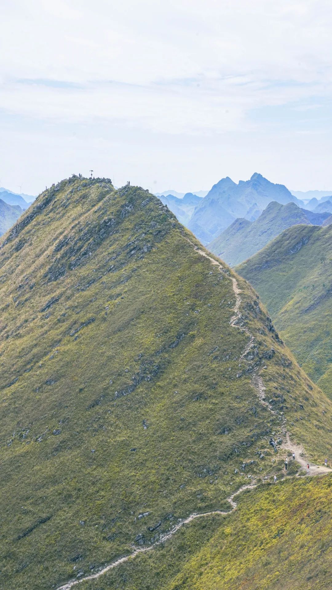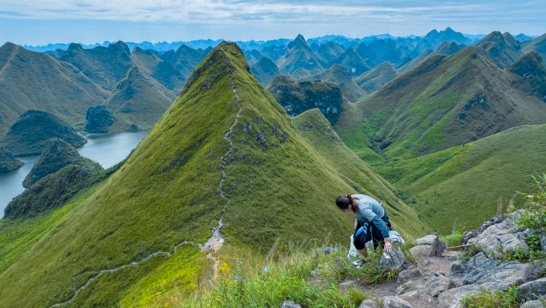 登上1号峰,开始走山脊线,好不开阔,远山和田园360°全景模式,层峦叠嶂的峰丛,山脊两侧的草甸还没完全绿,因为干旱山脚下水库干涸,所剩不多的湖水阳光下呈碧绿色,如翡翠般镶嵌于群山之间,周围一座座小山如岛屿般耸立,阳光下山为笔,水为墨,山水光影的层次近在眼前,我只能说,人总是会被喀斯特地貌特有的山水一次又一次震撼到。