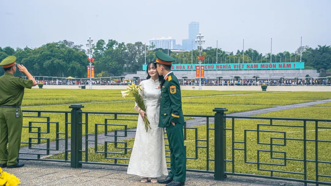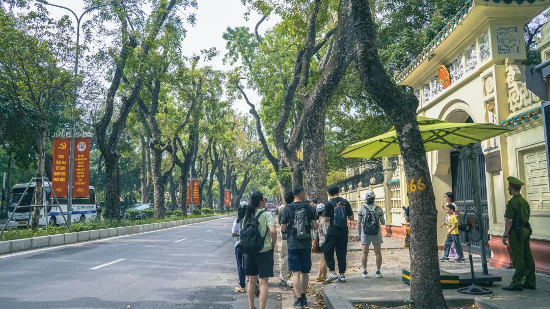 路过大使馆一条街,走到巴亭广场,巴亭广场在胡志明纪念堂前,是河内的重要地标,这是越南最大的广场,我们到的时候越南也正值假期,超多本地人穿着传统服饰奥黛,手拿百合花,非常郑重和有仪式感,在这里拍照类似于,我们中国人到北京要在天安门广场端庄的咔嚓一张一样。