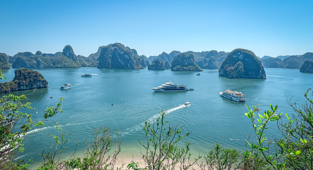 出洞发现天晴了,正好看见了蓝天的下龙湾,小岛和停在远处的邮轮与蔚蓝色的海水相互映衬,绘成一幅山海图。