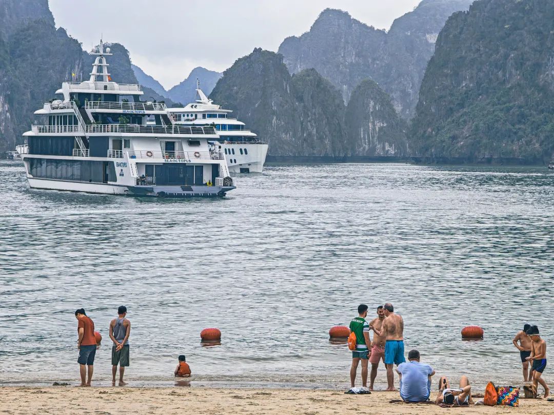 首先到达天堂岛,我们从大船换游艇小船上岛,沿着蜿蜒台阶路一路上山,站在山顶可以俯瞰整个下龙湾,上午的天还有些阴雨蒙蒙,远处的岛屿在云雾中若隐若现,遗憾没有看到阳光下的湛蓝海岸,这里的欧美人很多,很多人在沙滩上享受日光浴(或紫外线浴?),多少有点西海岸那味儿。