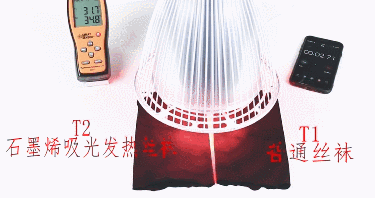 与其他丝袜相比,吸光发热升温更有优势,如下图实验,在卤素灯光照1分钟时间下,石墨烯丝袜的吸热温度比普通丝袜高了8.9度。