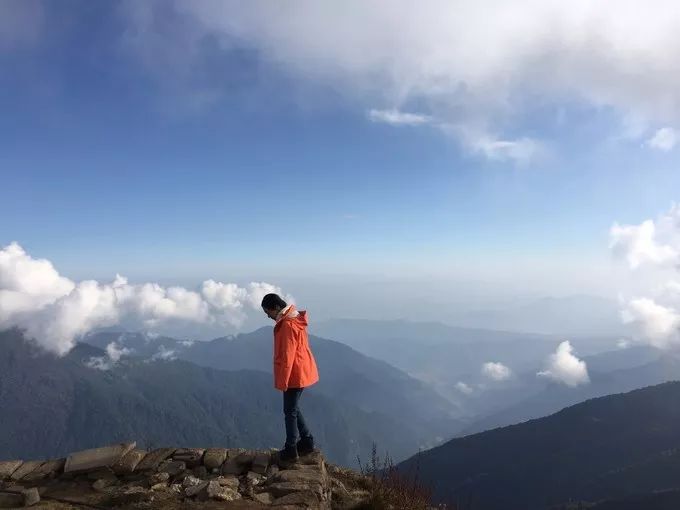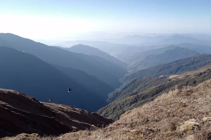 海拔开始不断上升,累的时候,就往路边一坐,看看上面的雪山,看看下面无尽的山脉,在路上的感觉很好