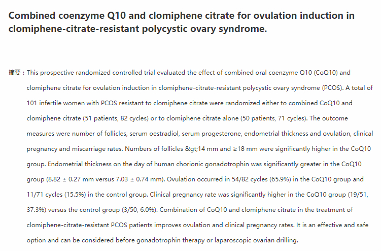 2014 年,《生殖生物医学在线》[3]指出,耐克罗米芬多囊卵巢综合症的女性患者在接受促性腺激素或腹腔镜卵巢打孔术治疗前,辅酶 Q10 与克罗米芬联合用药可安全、有效地改善其排卵和临床妊娠率,同时>14mm 和≥18mm 的卵泡数显著增加,子宫内膜也明显增厚。