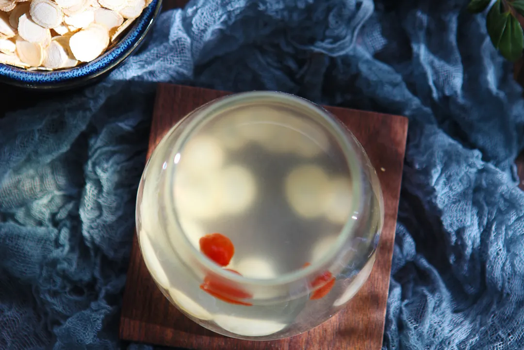 功效:常常熬夜的人容易气阴两虚,过度劳累容易伤脾气,而晚睡或熬夜则容易暗耗肾阴肝血。西洋参味甘、微苦,性凉,入肺、心、肾、脾经;有气阴双补之功,既能补益脾胃之气,兼能养阴生津;还能补心肺气阴。枸杞味甘、性平,归肝、肾经,有滋养肝肾,益精明目的功效。两者搭配,适合熬夜过后,出现气阴两伤的人饮用。