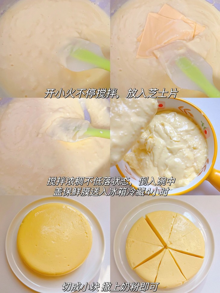 3️⃣倒入容器中盖保鲜膜,冰箱冷藏4小时,取出轻松脱模切块。表面撒上奶粉~