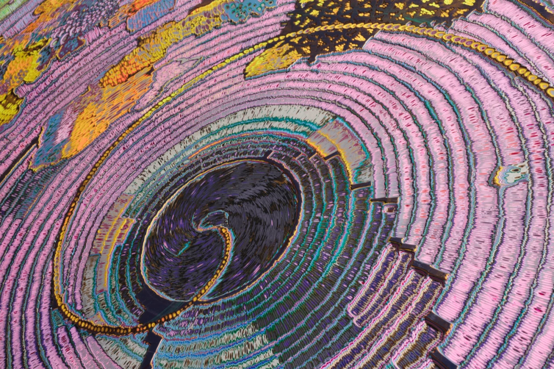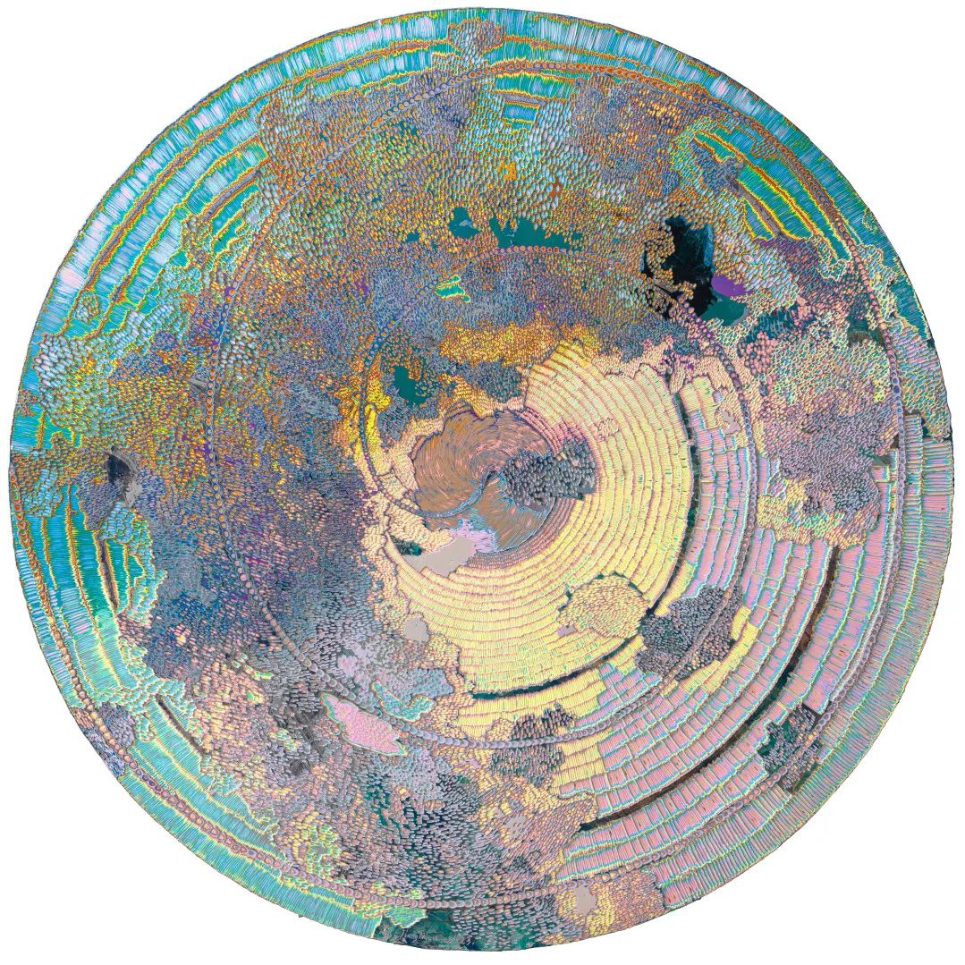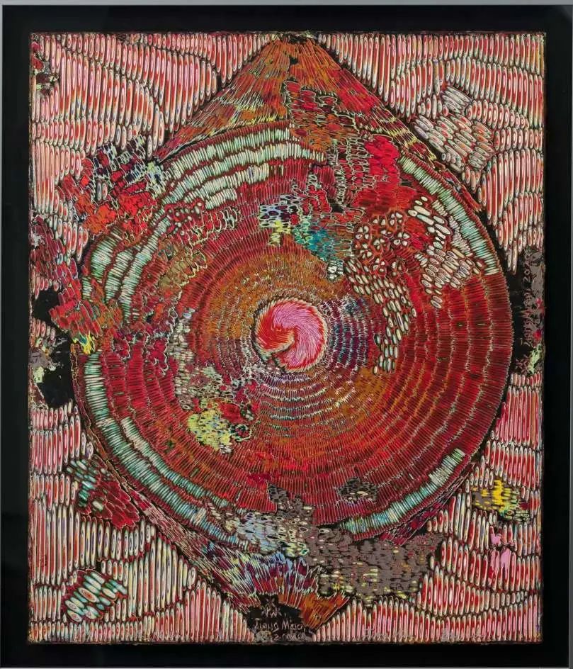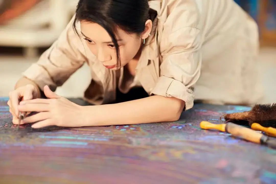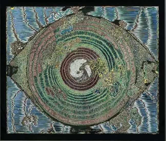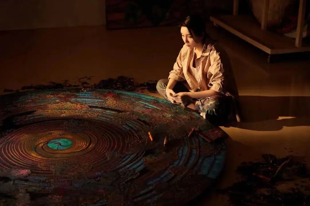 艺术家姜森运用精准的刀刻技术,雕刻出如宇宙星辰一般的画面,每一道痕迹都诉说着生命的轮回与无穷的宇宙能量。她的作品通过微妙的线条和形状,传达出生命永恒的主题。色彩斑澜的刀刻丙烯作品的表面底下蕴含着三十层以上的色彩,每一层皆由姜森采集当下遇到的人以及感受到的阳光、风、空气和温度,纪录下自身感知,将这些封存在一层层色彩的时光宝盒中,又在她的雕刻刀起落之间,能量一层层地逐渐被开启。画面中那个圆,是磁场、旋(即灵魂的符号)和点线面的物质。也是灵魂体三位一体的重组。