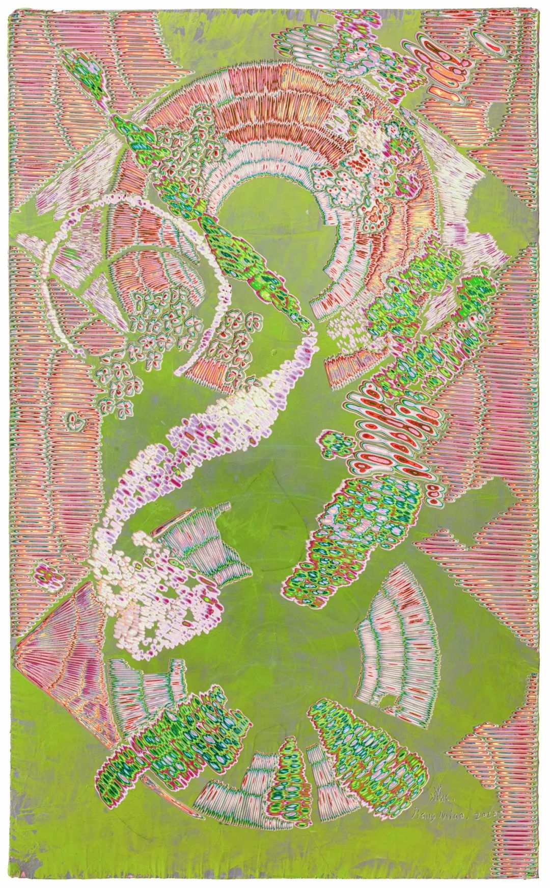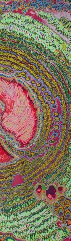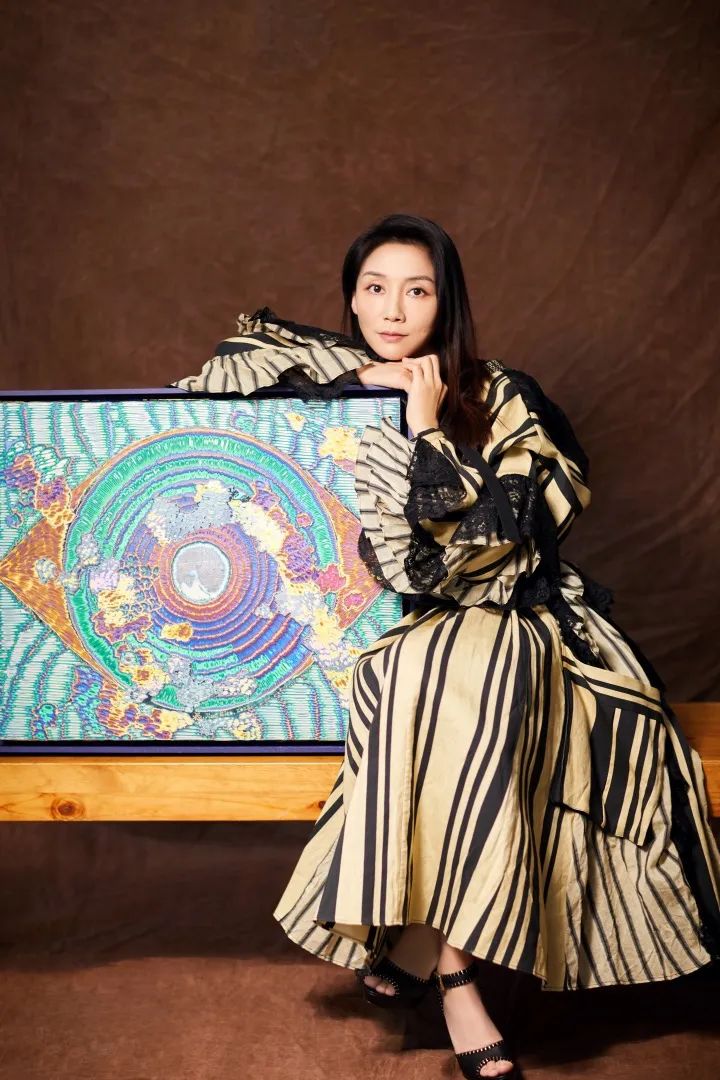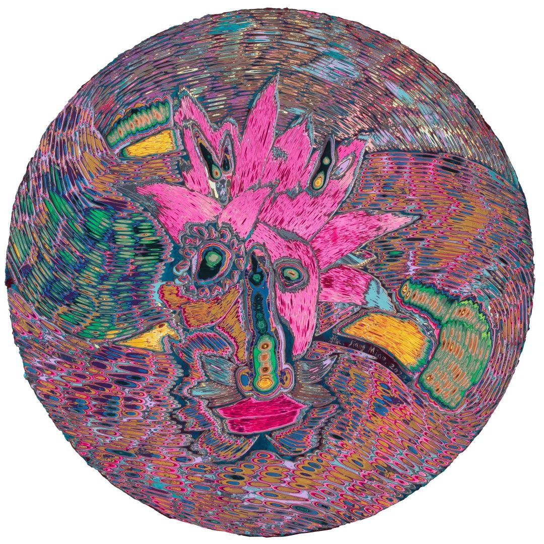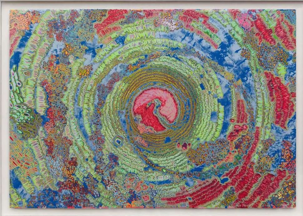 艺术家姜森运用精准的刀刻技术,雕刻出如宇宙星辰一般的画面,每一道痕迹都诉说着生命的轮回与无穷的宇宙能量。她的作品通过微妙的线条和形状,传达出生命永恒的主题。色彩斑澜的刀刻丙烯作品的表面底下蕴含着三十层以上的色彩,每一层皆由姜森采集当下遇到的人以及感受到的阳光、风、空气和温度,纪录下自身感知,将这些封存在一层层色彩的时光宝盒中,又在她的雕刻刀起落之间,能量一层层地逐渐被开启。画面中那个圆,是磁场、旋(即灵魂的符号)和点线面的物质。也是灵魂体三位一体的重组。