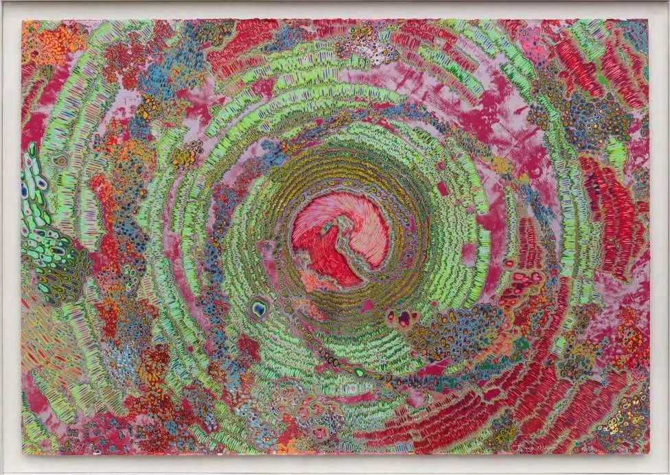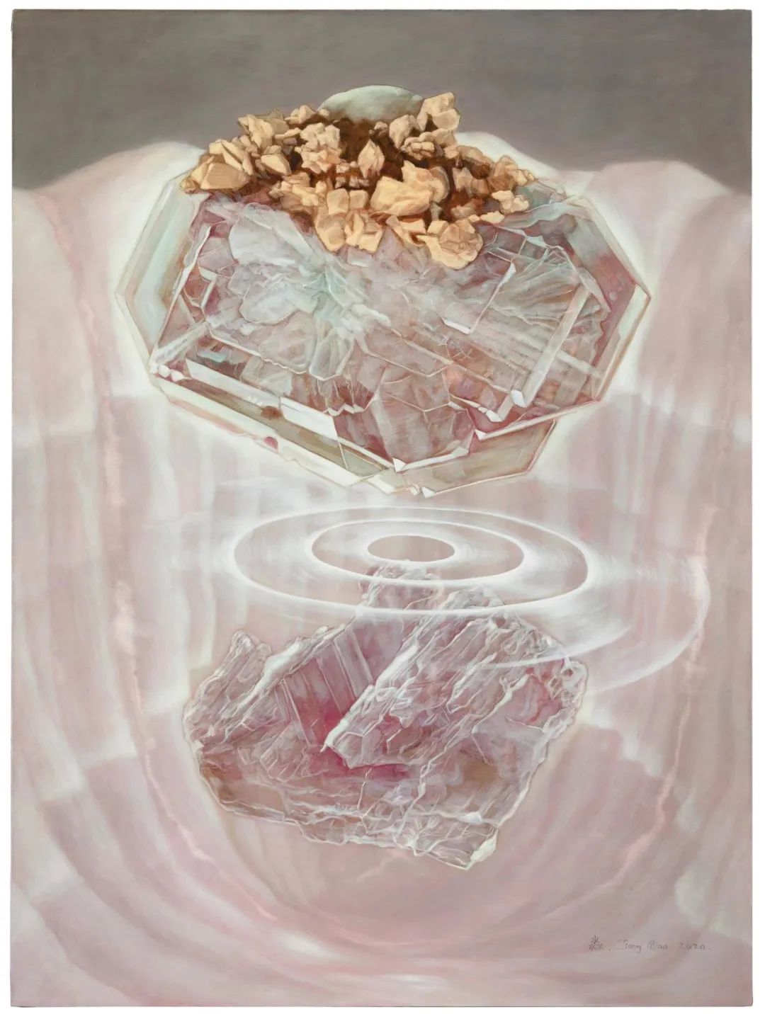 《水·界》系列作品中,姜淼的风格明显柔和了许多,作为生命最初的来源,姜淼的描绘的水体罩染出多种色彩,充满生命的能量。儿时常在梦里见过的风景在画面中呈现,在姜淼的印象中,梦中水与空气的温度让她感觉安全又温暖。而涟漪泛起无限放射的同心结构,也成为了姜淼在下一阶段创作的重要线索。