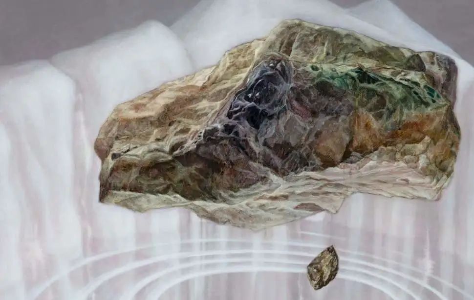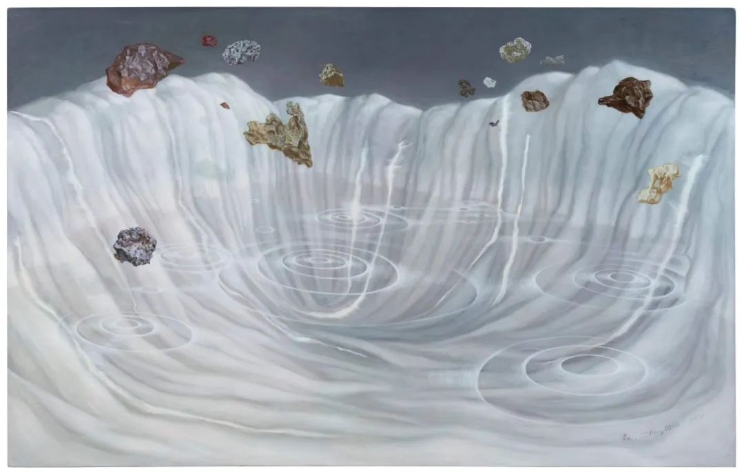 我画的是安静的水,隐含在天地万物之间,与能量体相遇,便显出光晕,是灵光的乍现,是生命的迹象来自遥远太空的陨石,经历漫长的燃烧,暂留于此孕育能量与生命的能量体是艺术家创造出的一种新的视觉体验。