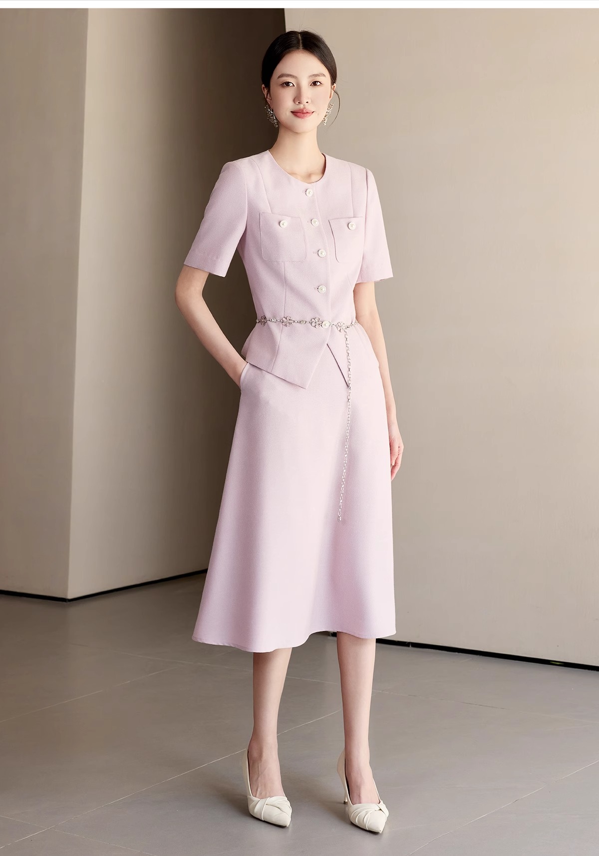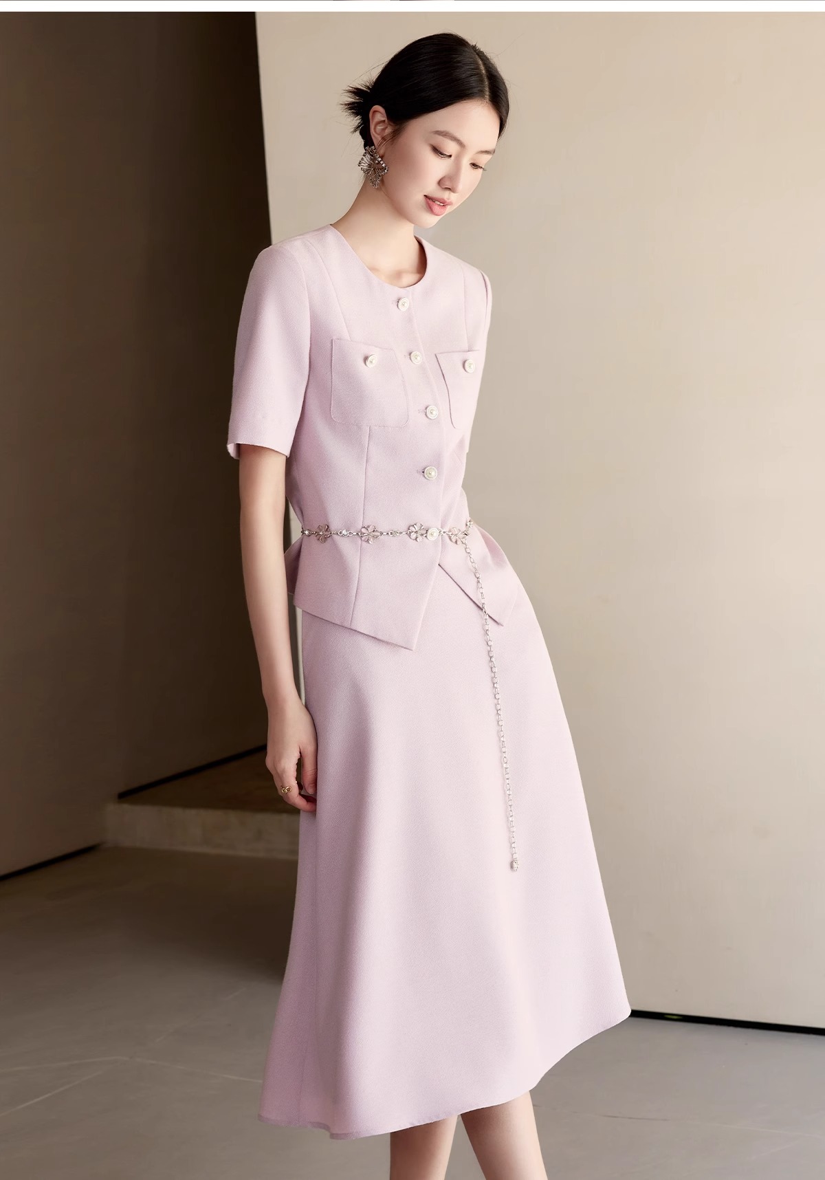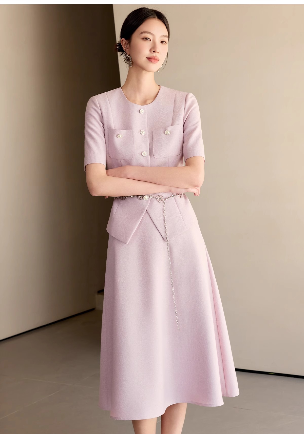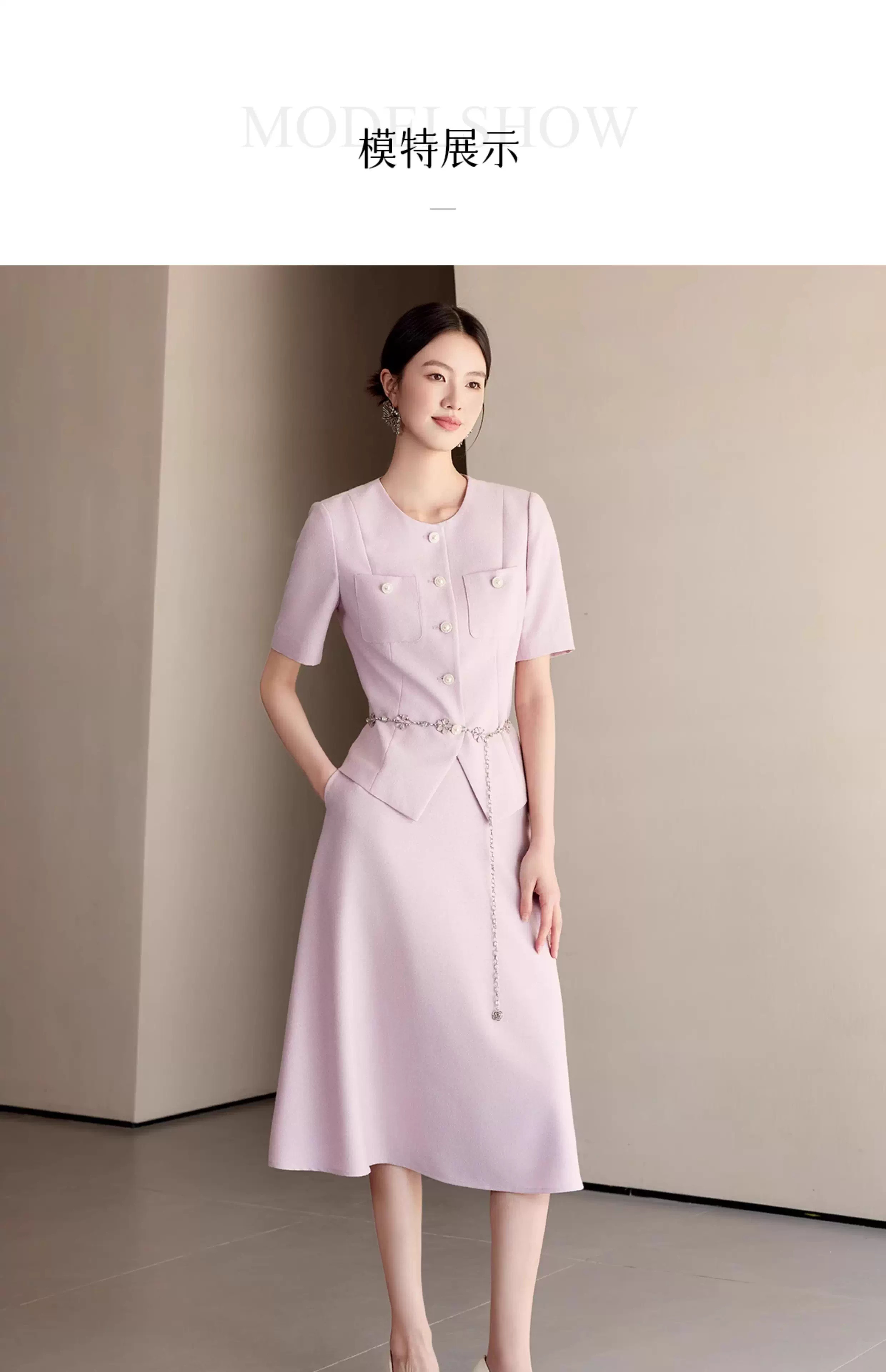 淡粉色自带温柔滤镜,把春日的浪漫揉进了香风连衣裙里。利落的圆领搭配精致的排扣,是经典香风最动人的表达。