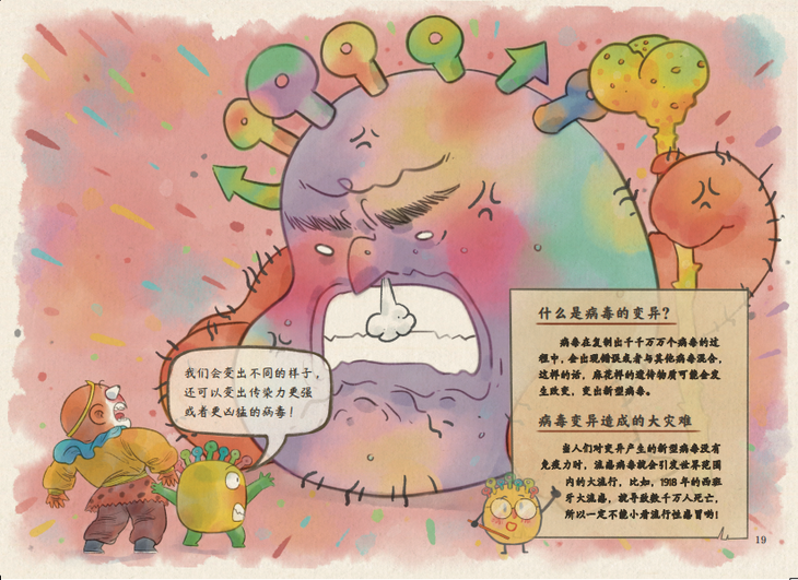 为了让故事和知识文本能够做出一些区分,在知识部分,每个小病毒都是戴着眼镜的,给孩子来普及相关的知识。