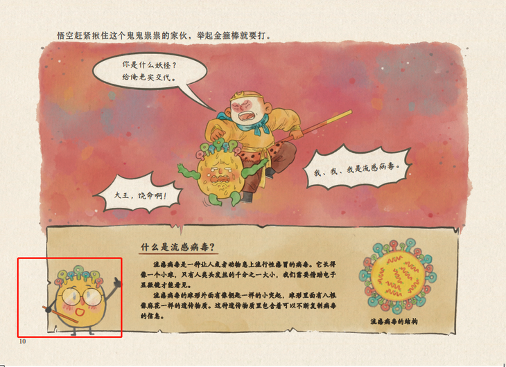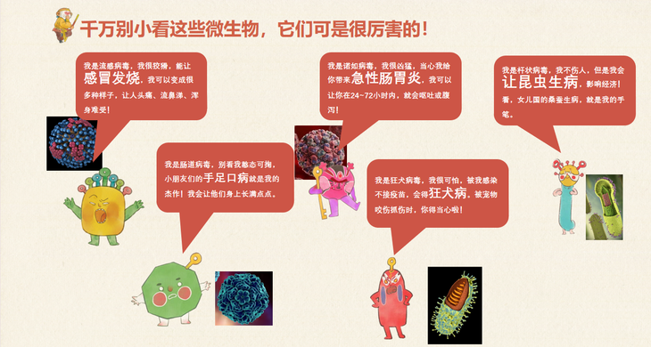 为了让孩子更好地理解微观世界,我们每个病毒拟人化,通过悟空发现病毒,查清来历、了解复制过程,探查防护和治疗方法的过程,来让孩子们看到一种因为病毒引起的疾病,从感染到生病再到最后痊愈的整个过程。