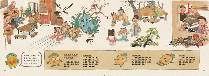 这样,我们把人感染病毒的过程、生病的原因、如何防御病毒、如何在生病之后采取家庭中实际可行的措施都融入到故事场景中,就能让孩子用更加生动形象的方式认识微观世界。