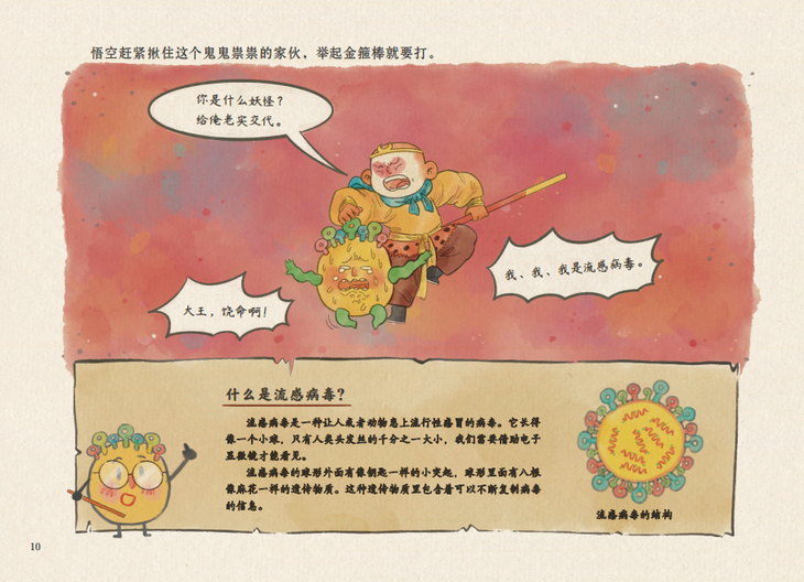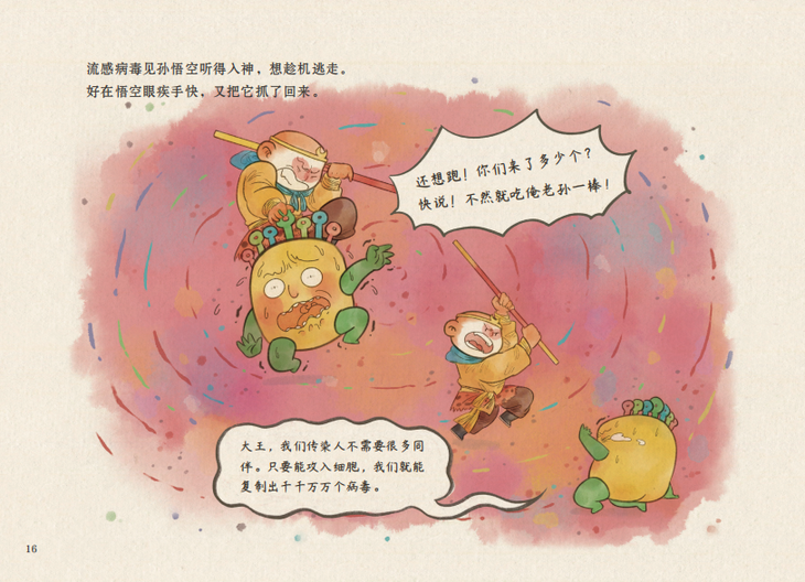 流感病毒见孙悟空听得入神,想趁机逃走。好在悟空眼疾手快,又把它抓了回来。迫不得已,病毒老实交代了自己在人体的复制过程。
