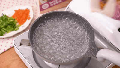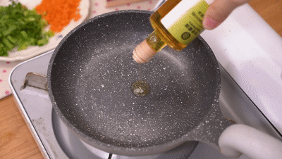 锅中热油,放入肉末、胡萝卜和青菜翻炒熟。