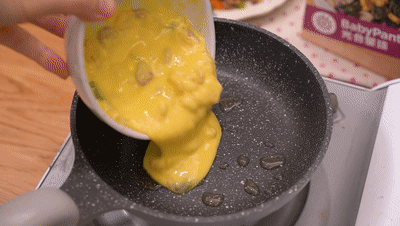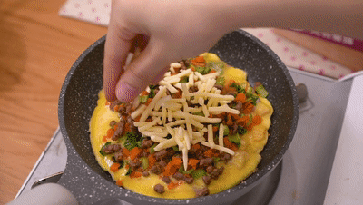 在锅中摊开,煎至稍微凝固,在上面铺上刚炒好的蔬菜肉末,最后撒点奶酪,盖上锅盖焖2分钟左右至奶酪融化就可以了。