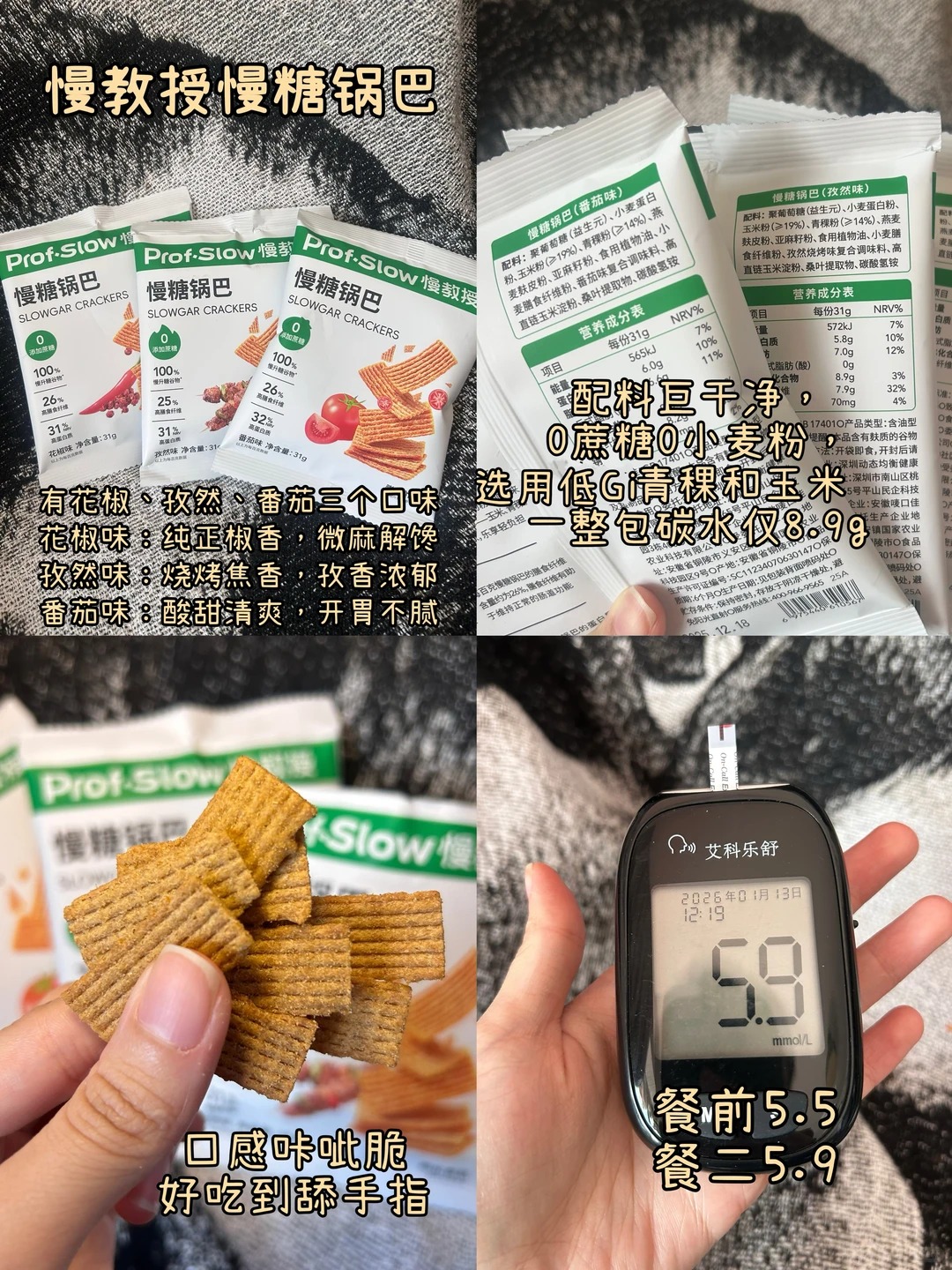 甄选青稞、玉米等低GI优质慢碳水,1袋锅巴碳水仅约8.9g!糖友亲测:餐前5.5,餐二5.9,加餐解馋放心炫!