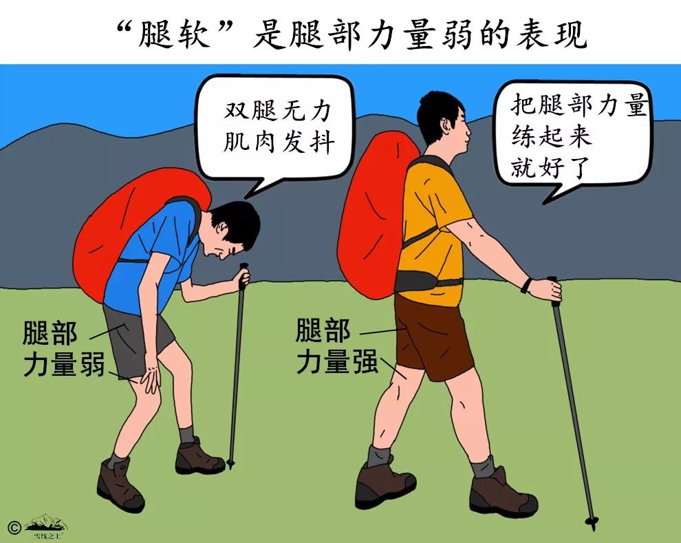 腿部负担了身体和背包的全部重量,还需要抗住脚落地时的冲击。腿部力量不足的话,就会很快达到肌肉耐力的极限,造成肌肉剧烈收缩,无法发力,在放松时出现颤抖的情况。