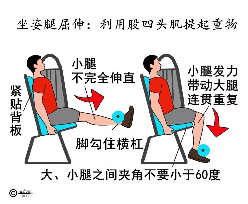 针对股四头肌的专项训练。坐姿腿屈伸几乎只用到了股四头肌的力量。
