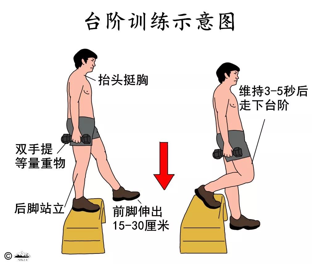 双手提着等重的重物(2.5kg的哑铃相对合适)站在台阶上,一只脚向前伸出15-30厘米,用后脚支撑身体,维持3-5秒后,慢慢走下台阶,再转过身,踮起脚尖慢慢走上台阶。