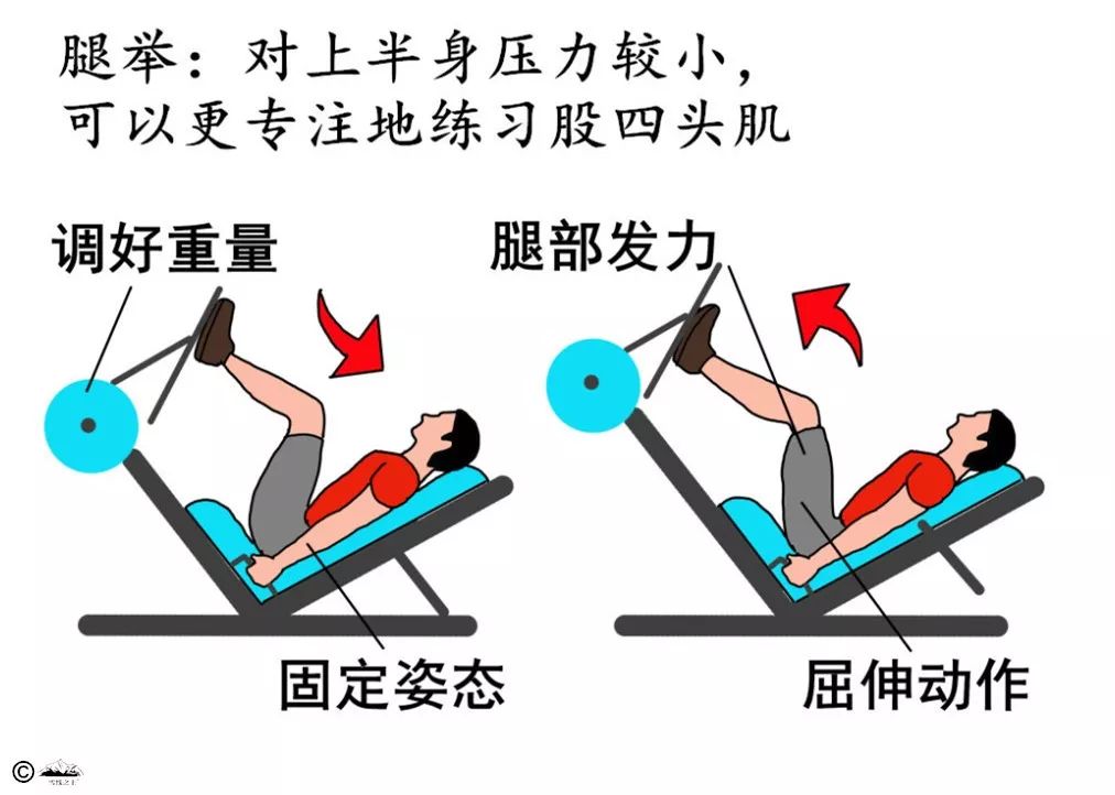 在健身房中有专门针对腿部力量训练的器械,并且可以调节重量,有利于你循序渐进的进行训练。