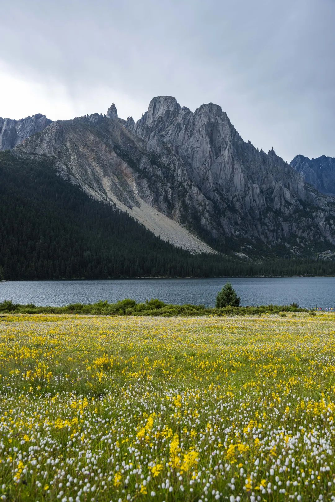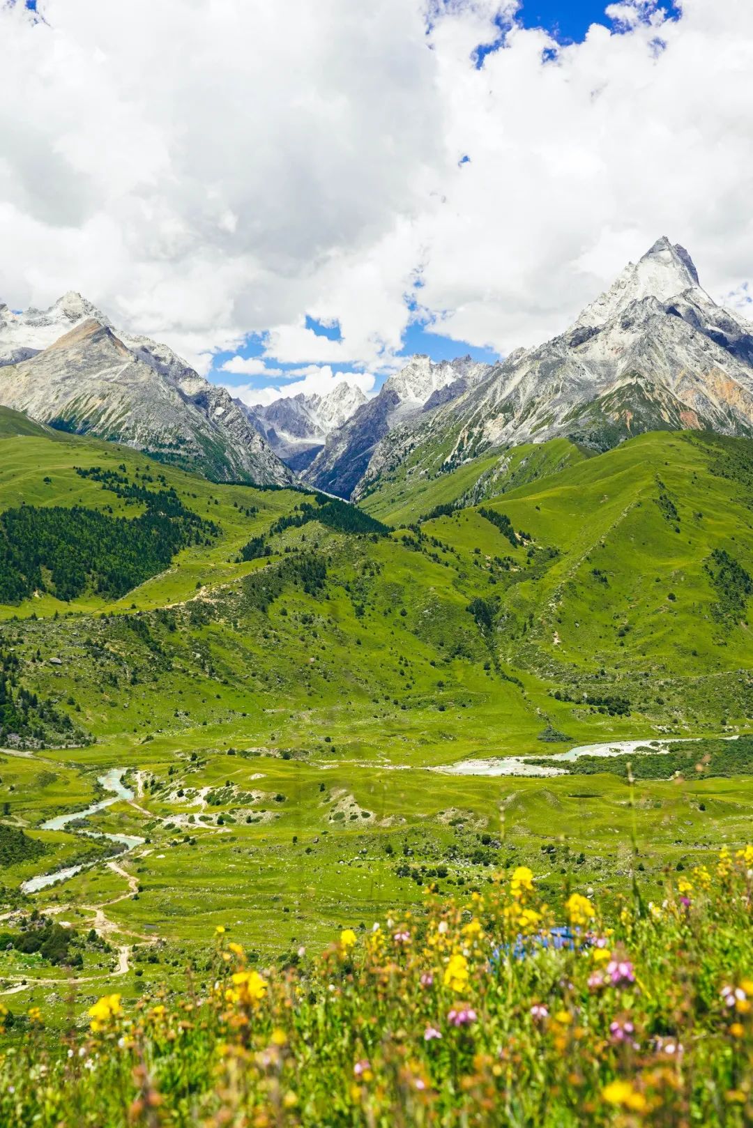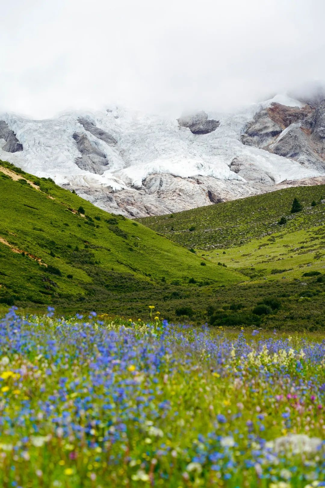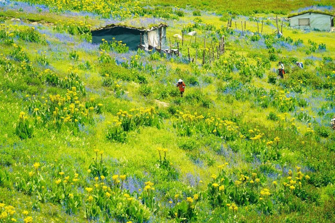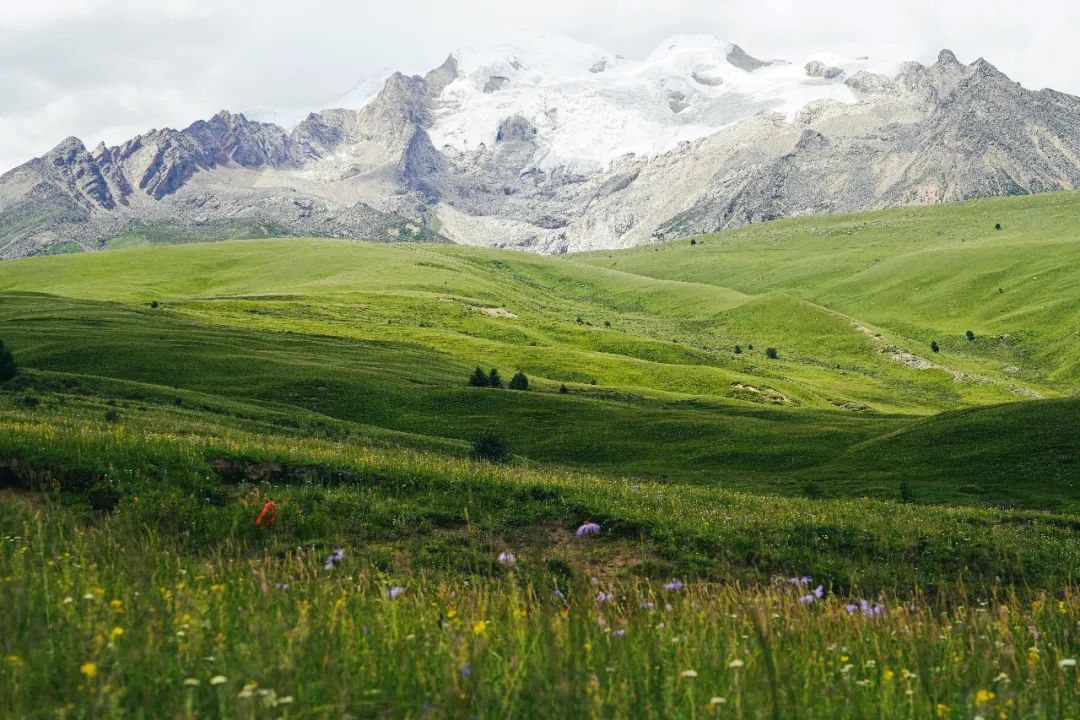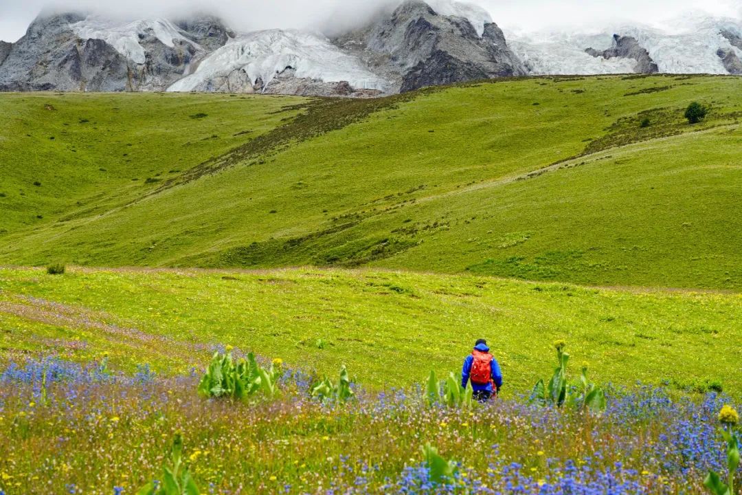 现在正是夏花盛放的季节,绿色的花苞,红色的花蕊,左一片右一摊,像铺满了不规则的花地毯,而在通往远处雪山的高地上,五颜六色的野花开得像海洋一样。