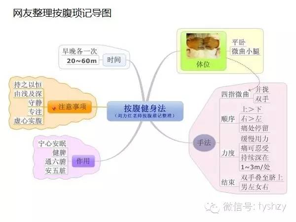 所谓按腹之"虚心实腹"其实就是一个专注!心无旁骛,唯系于手下之腹内,感受腹内及由此而引发的所有反应,享受此一过程。按腹乃体力和心智禅定兼具,按后通体微微汗出,乃于床上安息一会,双手重叠置于脐上,掌心对住肚脐,男人左手在下,女人右手在下,感受片刻腹内的变化。