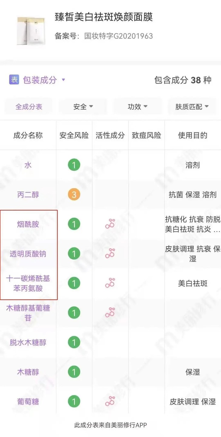 除了拿到美白特证,面膜中所添加的成分也尤其关键。