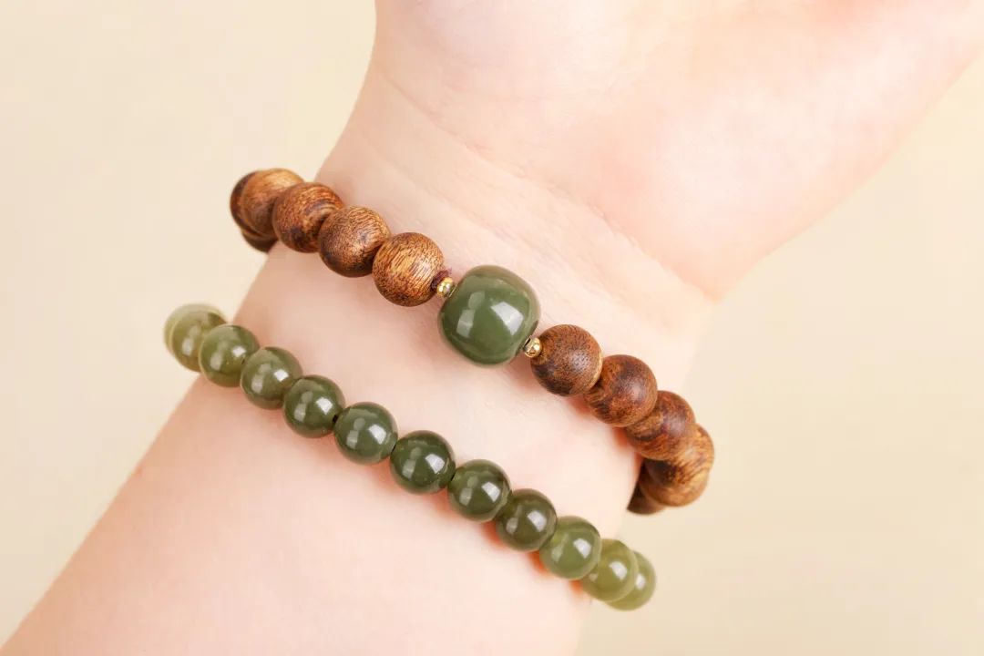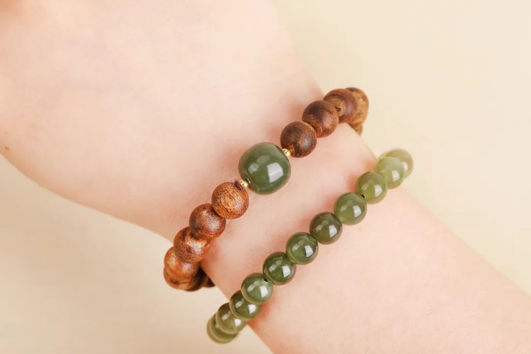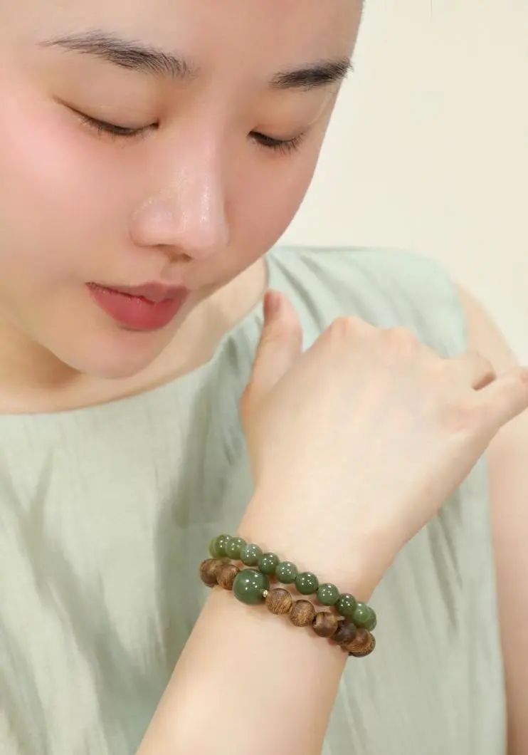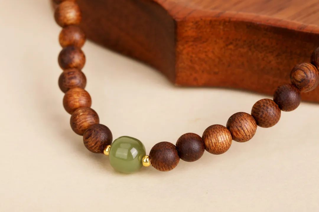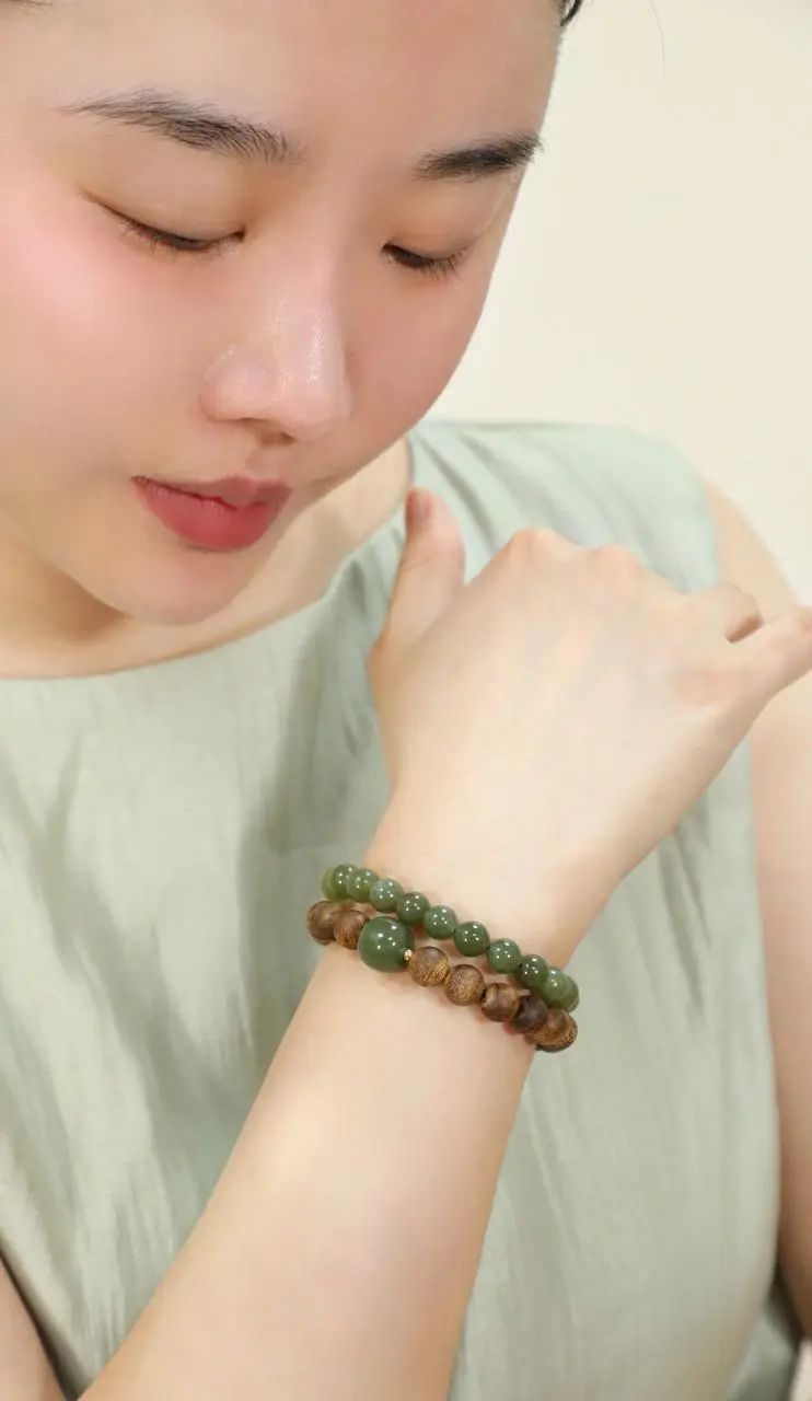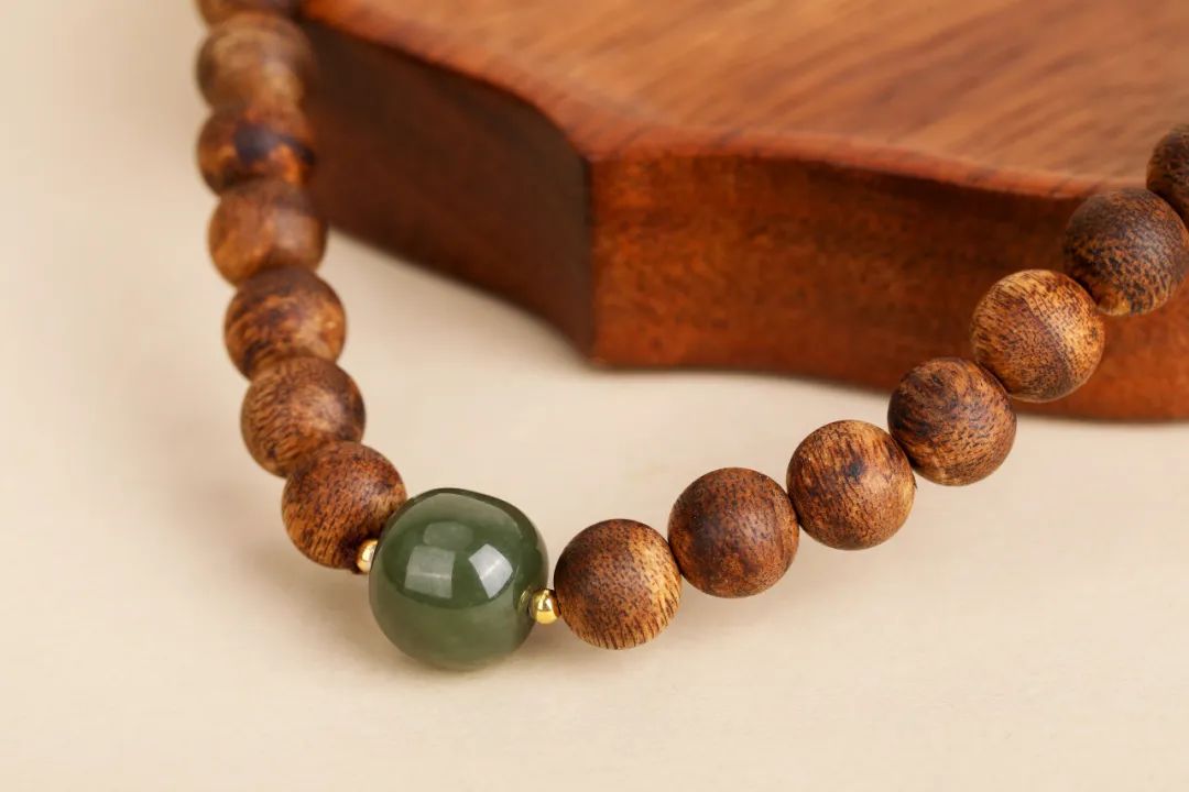 佩戴时,和田玉的温润光泽与沉香的醇厚香气相得益彰,把沉稳贵气的韵味诠释得刚刚好。