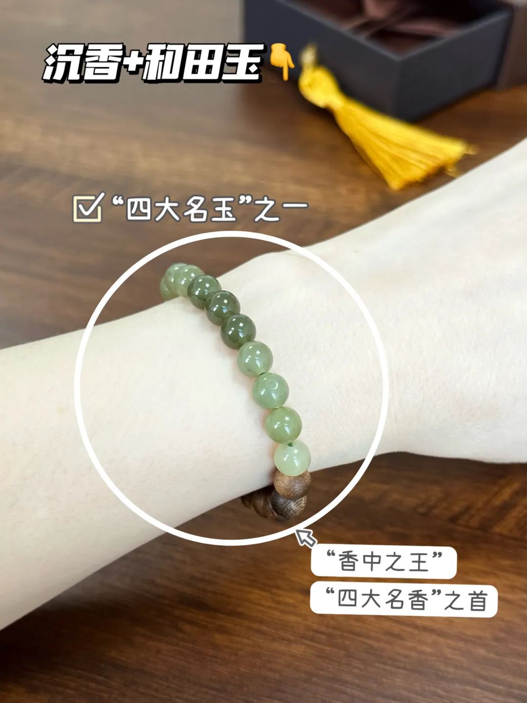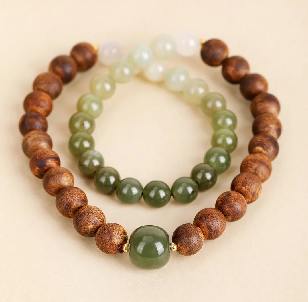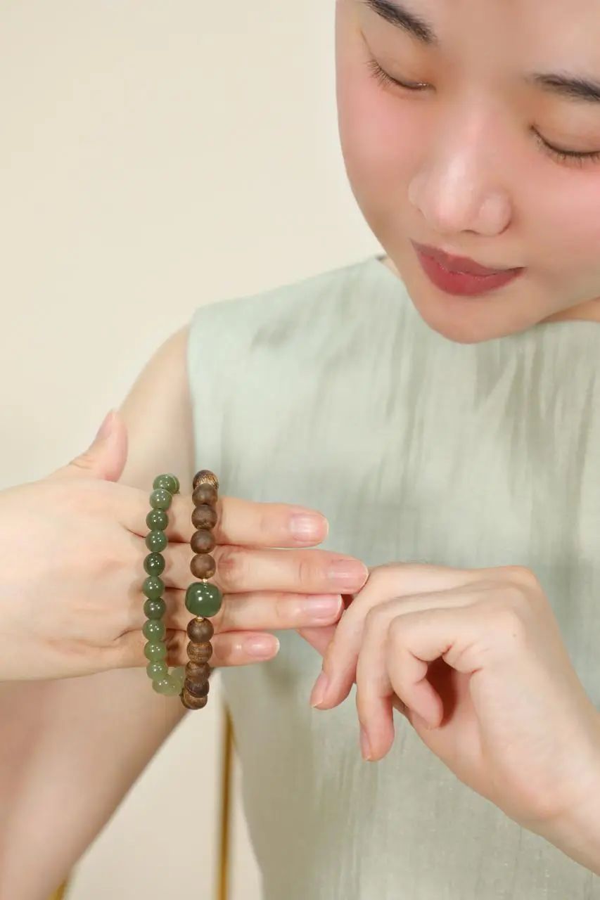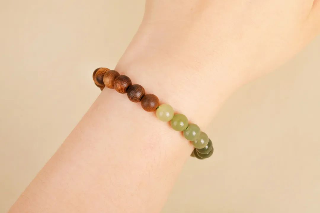 佩戴时,和田玉的温润光泽与沉香的醇厚香气相得益彰,把沉稳贵气的韵味诠释得刚刚好。