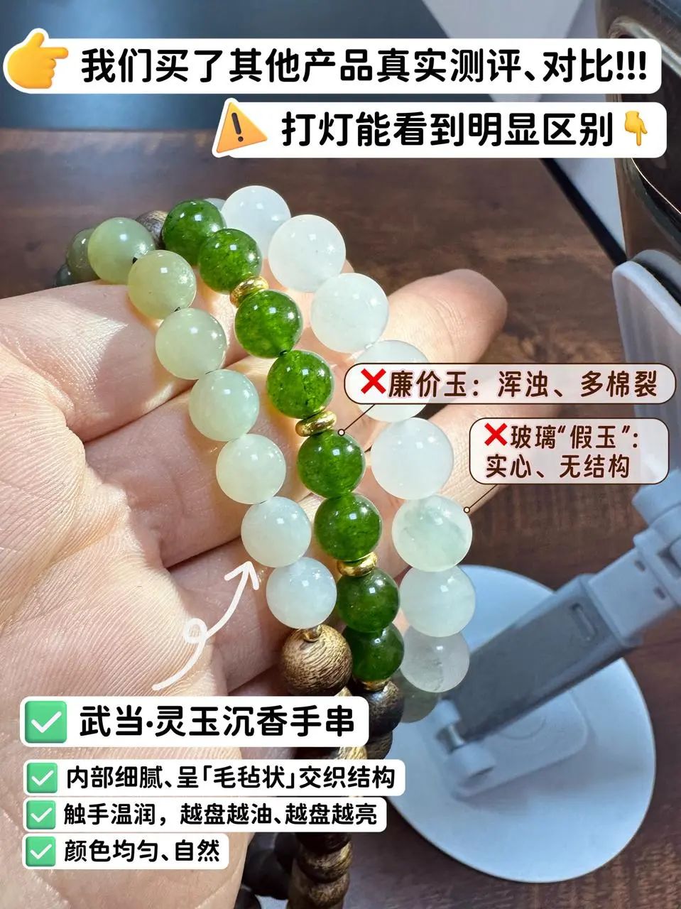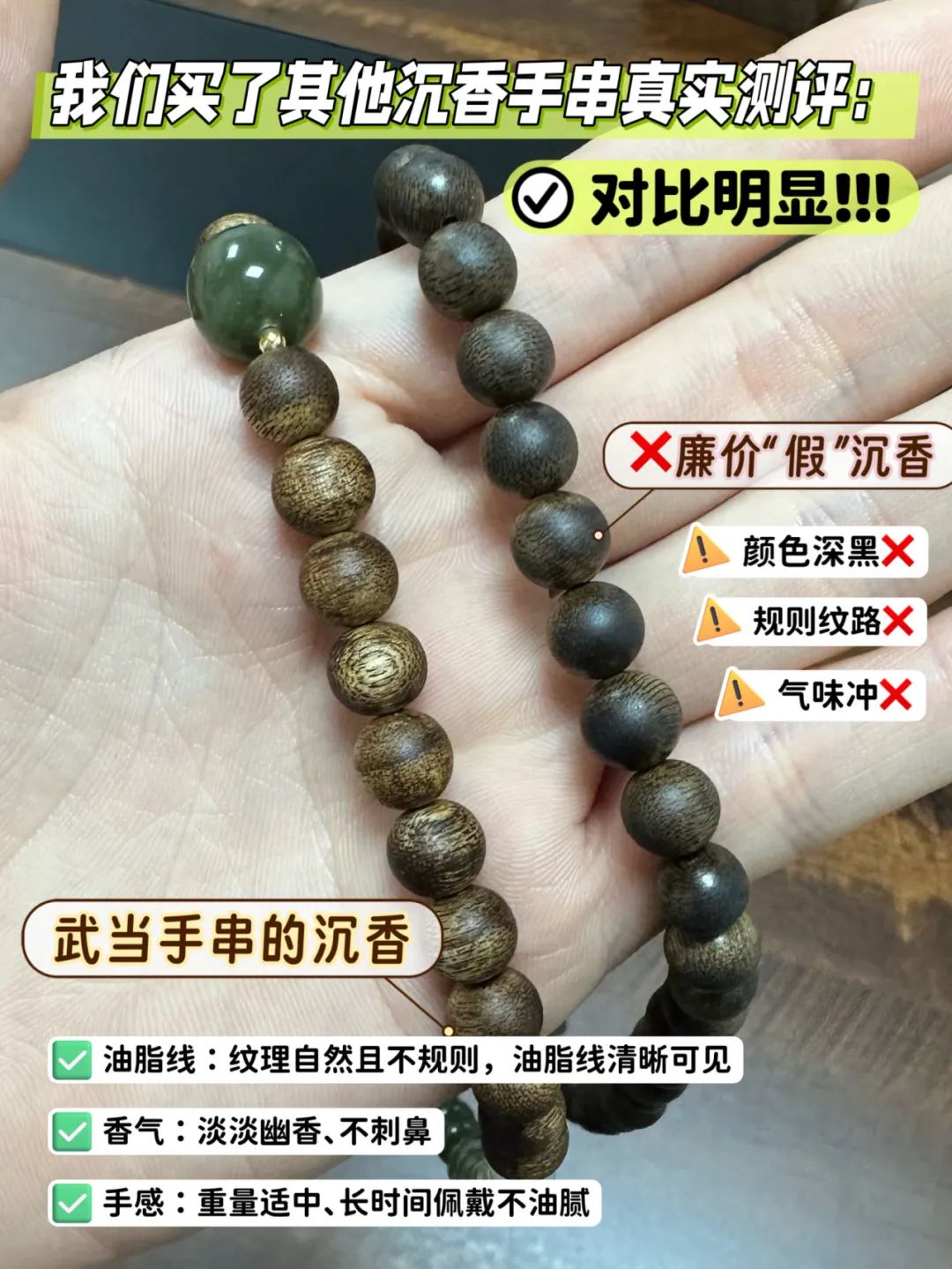 我们还购买了其他同款价位的手串,用【五法】对比,咱们这款里面的沉香估计就值几千块!