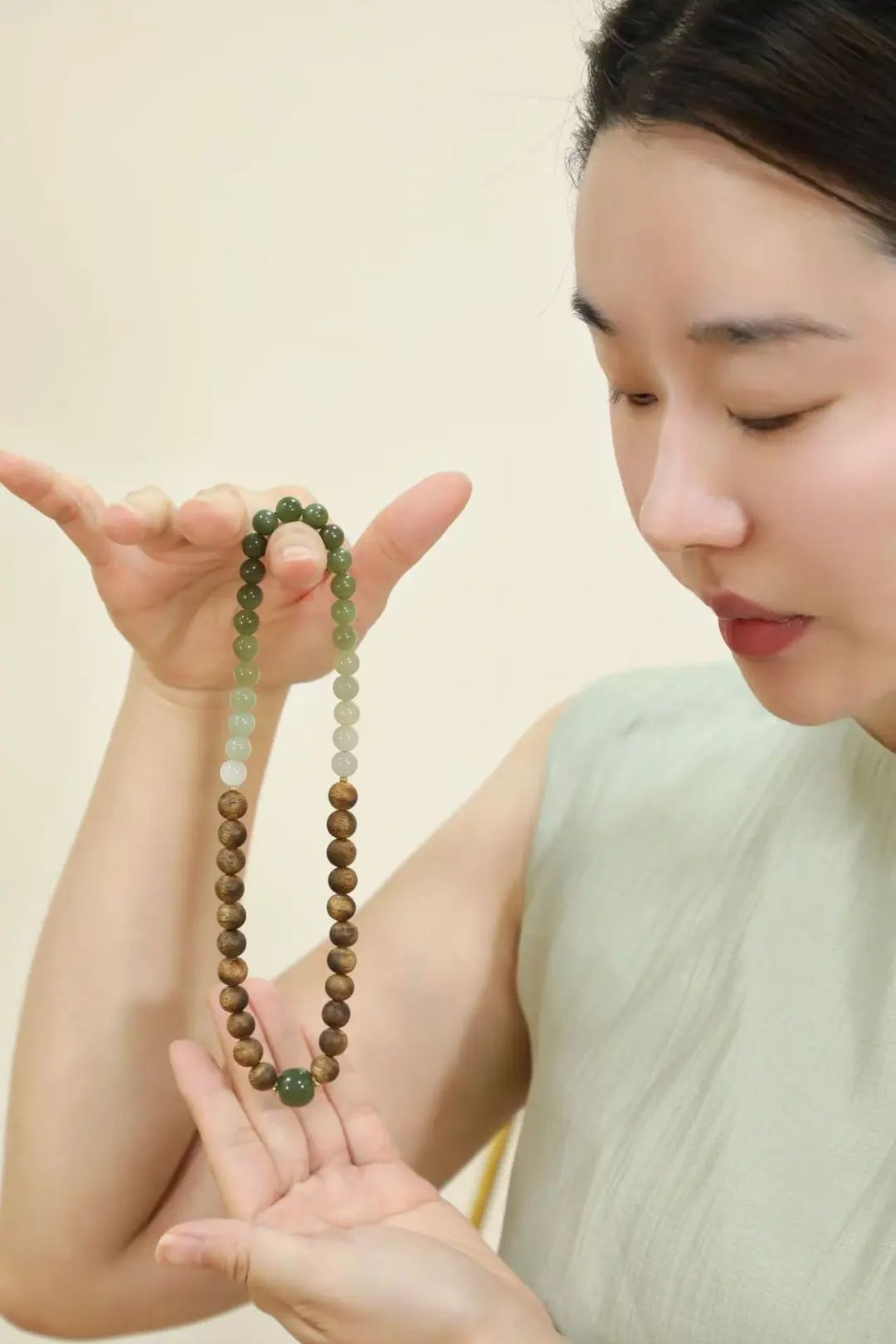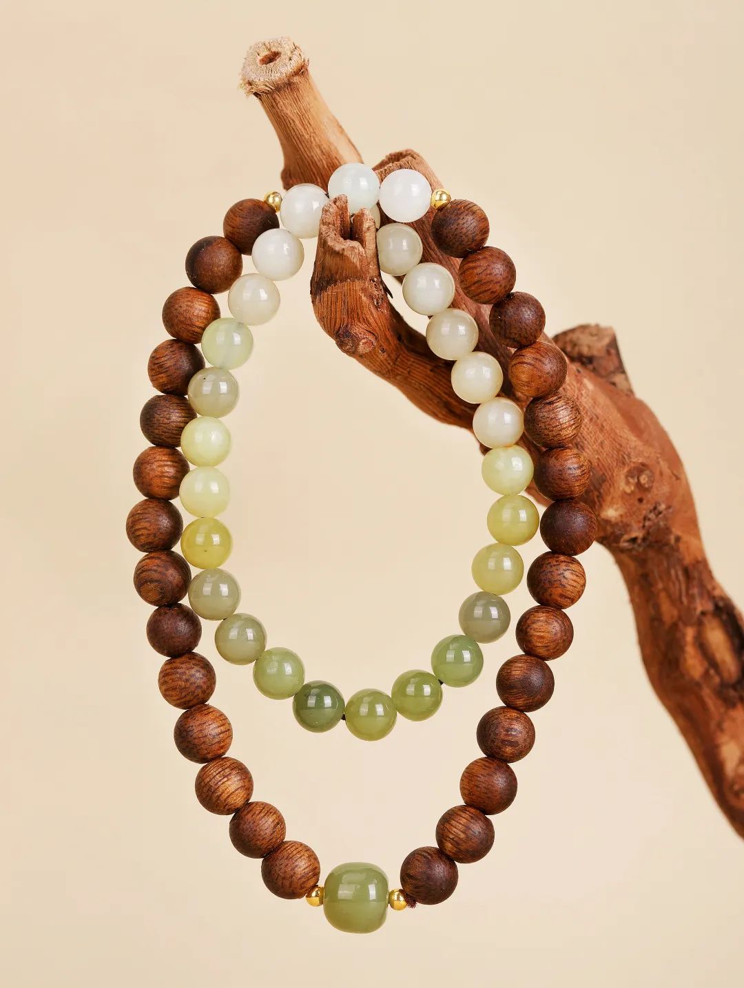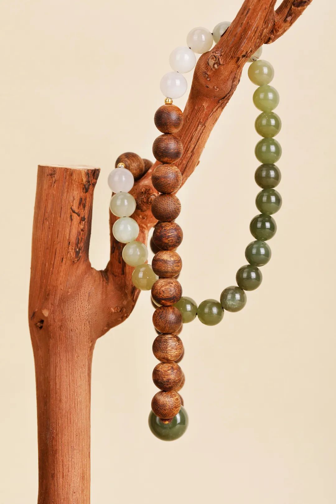它用10年以上树龄优质沉香木串起岁月淬炼的优雅,用新疆和田玉垂坠东方智慧。