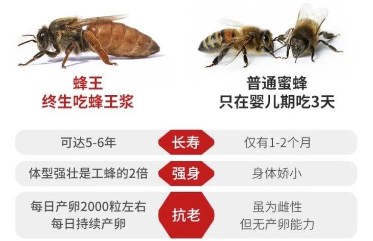 终身只食用蜂王浆的蜂王,不仅体型是工蜂的2-3倍,寿命也是普通工蜂的20倍以上。